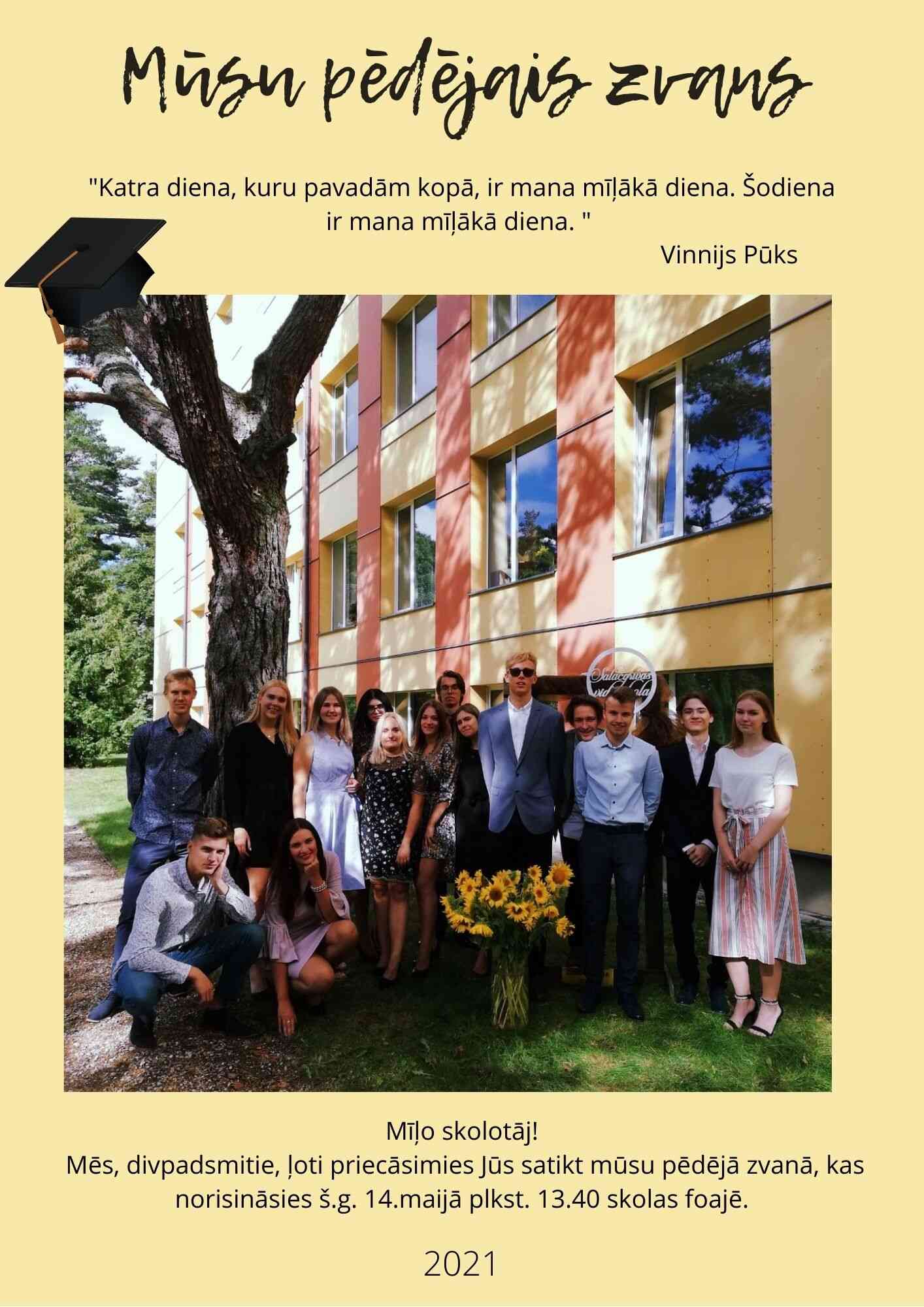 Tad jau arī laiks svinīgajai daļai – klātesot skolas vadībai, skolotājiem un 11.klašu skolēniem, zālē ienāca skolas abiturienti. Varēja redzēt, ka viņi izbauda šo brīdi. Pirms pasākuma sociālajos tīklos direktores p.i. Iveta Kupča rakstīja – “12 ir dinamisks skaitlis, kas cilvēku apdāvina ar neatkarību, rakstura stingrību un enerģiju. Viņi ir uzticami, disciplinēti, pašpārliecināti, iniciatīvas bagāti, vienmēr cenšas paveikt ko ievērojamu. To varam teikt arī par mūsu skolas vislielākajiem skolēniem – DIVPADSMITAJIEM, tādēļ viņi ir godam nopelnījuši mazu atelpas brīdi pa vidu lielajiem pārbaudījumiem jeb netradicionālais (šogad) “PĒDĒJAIS ZVANS” ir klāt!” Viņa atsauca atmiņā Vinnija Pūka citātu -‘’Tu esi drosmīgāks nekā Tu tam tici, stiprāks nekā izskaties un gudrāks nekā Tu domā’’, novēlot veiksmi pārbaudījumos un dzīvē, aicinot neaizmirst savu skolu. Klases audzinātājai Santai Čiževskai šis bija emocionāls brīdis kopā pavadīti pieci gadi, jaunieši no spurainiem pusaudžiem izauguši par jauniešiem, kas dodas dzīvē. Skolēni bija sagatavojuši video, izceļojot cauri visiem mācību kabinetiem, kā arī teica paldies vārdus skolotājiem un skolai. Un tad arī bija brīdis saņemt žetonus – piederības zīmi skolai. Kopā ar žetonu skolēni saņēma arī raksturojumus un vēlējumus no saviem skolotājiem. Pēc tradīcijas žetons tika piesprausts arī pie skolas vimpeļa.