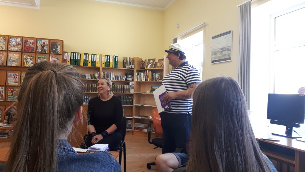 29.aprīlī Salacgrīvas vidusskolas 12.klases skolēni viesojās Salacgrīvas novada bibliotēkā, lai klātienē iepazītu rakstnieces Daces Vīgantes daiļradi. Tikšanos vadīja vienmēr atraktīvais Bibliokuģa bocmanis Gints Šīmanis un Liega Piešiņa, kuras humors, kā arī plašās zināšanas literatūrā, priecēja ikvienu pasākuma apmeklētāju. Bet tagad par visu pēc kārtas – Dace Vīgante ir rakstniece, kura sevi latviešu literatūrā pieteikusi spilgti. Kā norāda pati autore: “Sāku rakstīt tad, kad šķita esam par vecu literatūrai. Visi autori, kuru darbi mani aizrauj, bija sākuši radīt jau jaunībā. Tomēr nepiepildītības sajūta zemapziņā gruzdēja tik neciešami, ka sapratu: ja ar to neko nedarīšu, zemdegas izplēnēs, un mani sagaida vien pieklājīgā darbā uzkrāts pensiju fonds un rimtas vecumdienas ģimenes dārziņā pie puķu dobes.” Dace pastāstīja, ka izmanto ikvienu brīdi, lai lasītu grāmatas – pat sēžot rindā, šo laiku var izmantot lietderīgi un palasīt, jo tā ir iespēja ikvienam cilvēkam bagātināt savu valodu un vārdu krājumu. Autore iedrošināja arī klātesošos nebaidīties un izpaust sevi literatūrā. Kā to paveikt? Dace Vīgante teic šādi: “Nesen Literatūras festivālā Ķīnā jaunie pionieri man jautāja, ko darīt, lai kļūtu par rakstnieku. Teicu, lai seko saviem sapņiem. Tai neciešamajai gruzdoņai. Un raksta…”