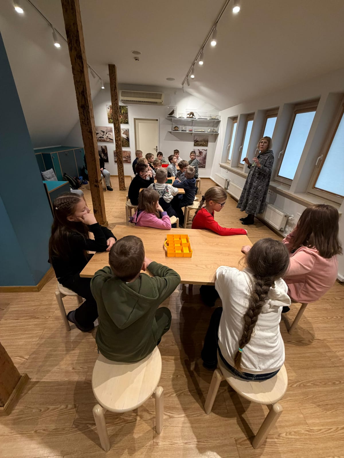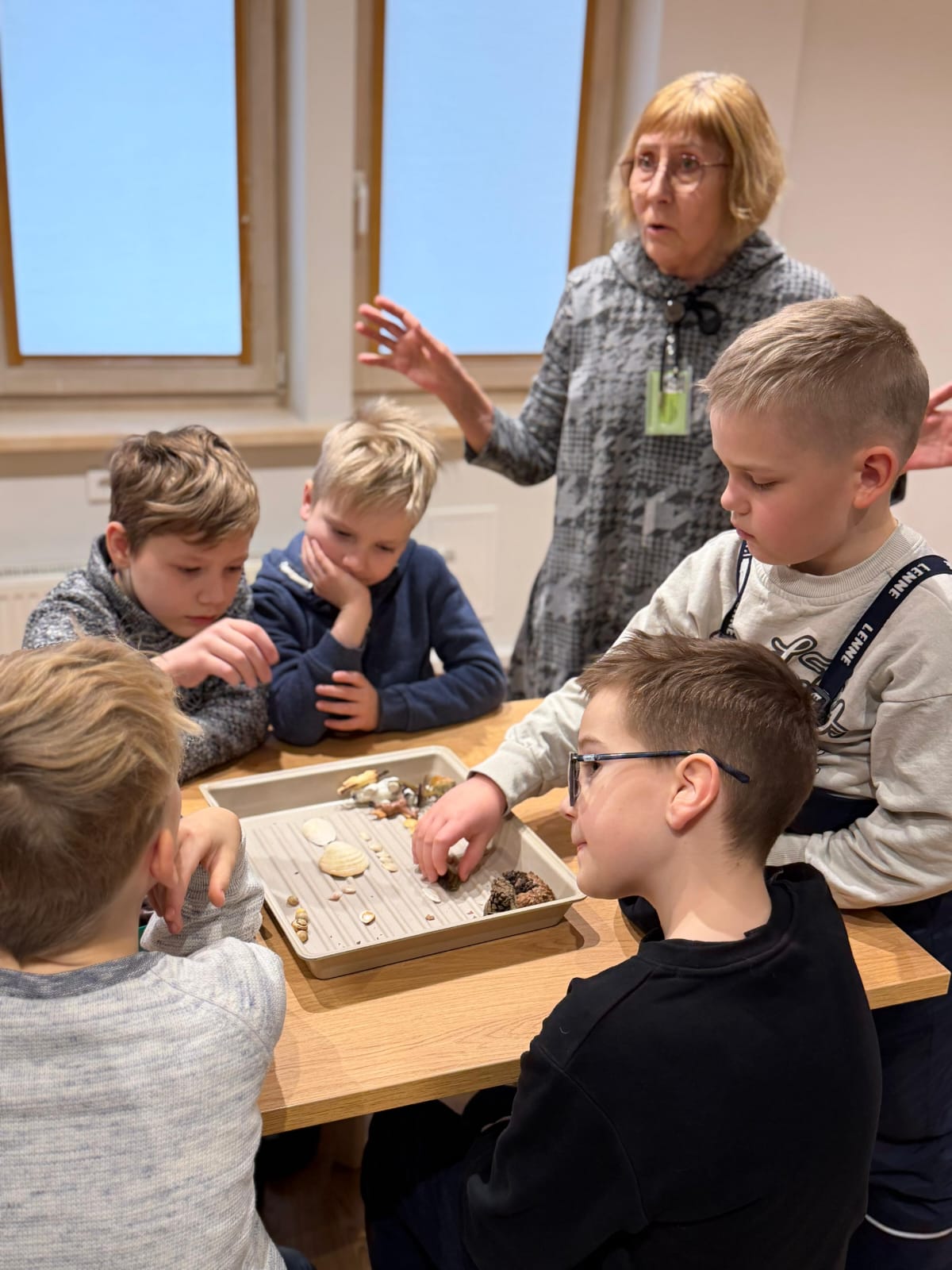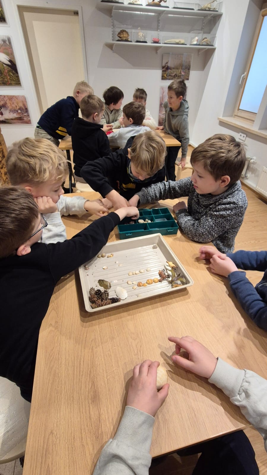 Muzejā bērni iepazinās ar dažādu muzeju veidu atšķirībām un saprata, ka muzejs nav tikai “vieta ar vitrīnām”, bet gan vieta, kur pēta, glabā un stāsta stāstus par mūsu pasauli. Nodarbībā skolēni mācījās šķirot priekšmetus, domājot par to, kur tie iederētos — zooloģijas, botānikas, entomoloģijas vai citos muzeja krājumos. Īpašu interesi izraisīja uzdevums atšķirt akmeņus no bruņuzivju pārakmeņojušajām bruņām, kuras Latvijā sastopamas dažādos atsegumos pie saldūdens. Bērni bija pārsteigti uzzinot, ka šādi atradumi slēpj vairāk nekā 350 miljonu gadu senus stāstus.