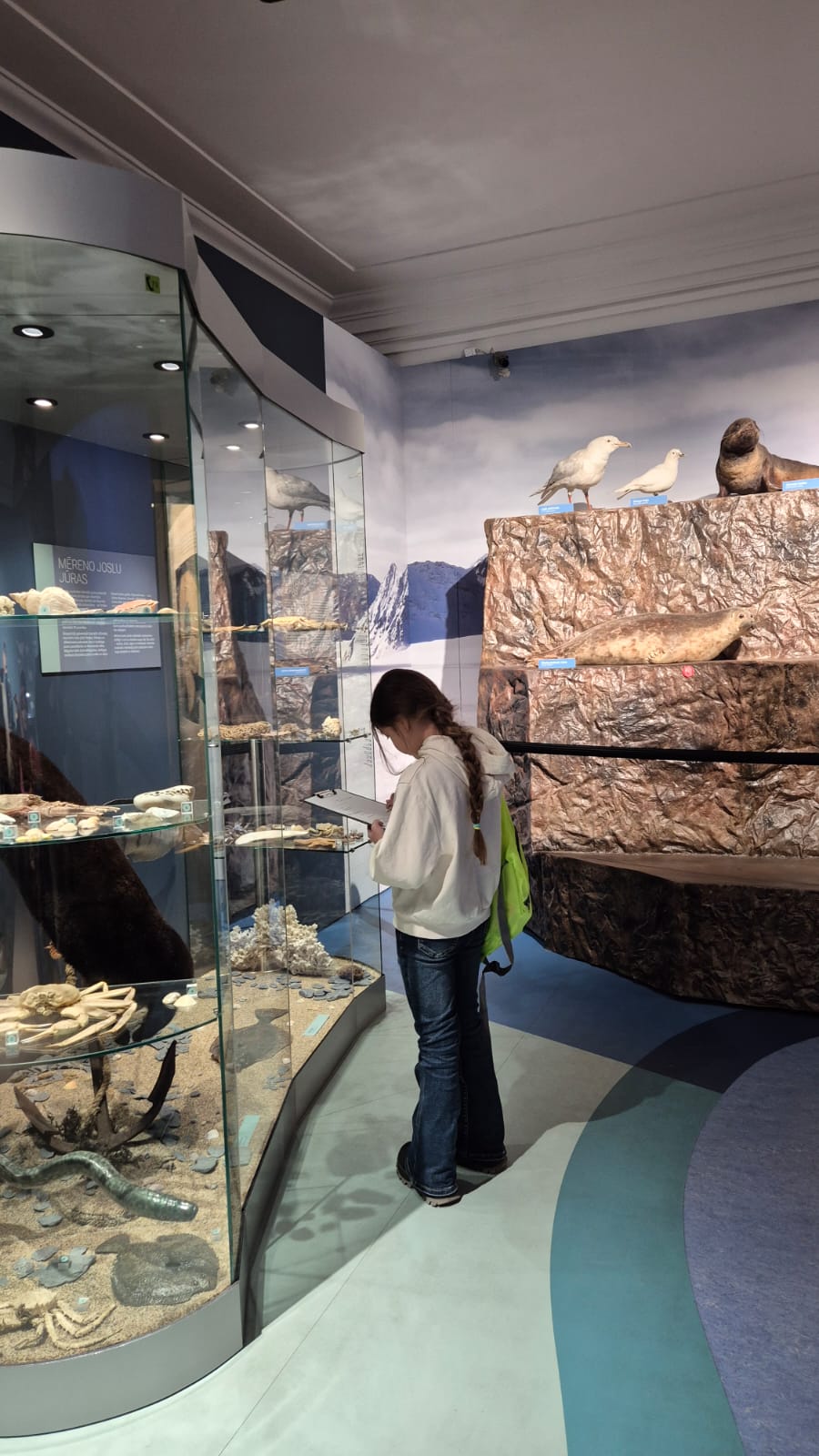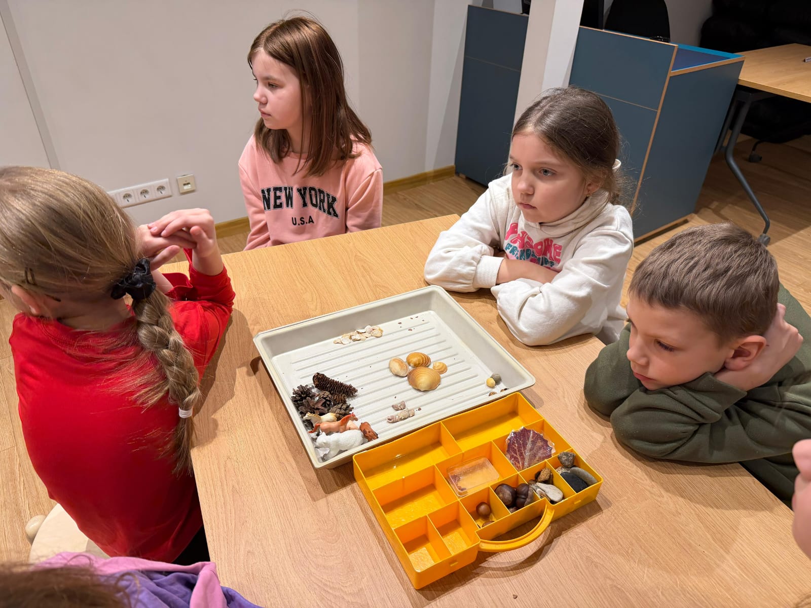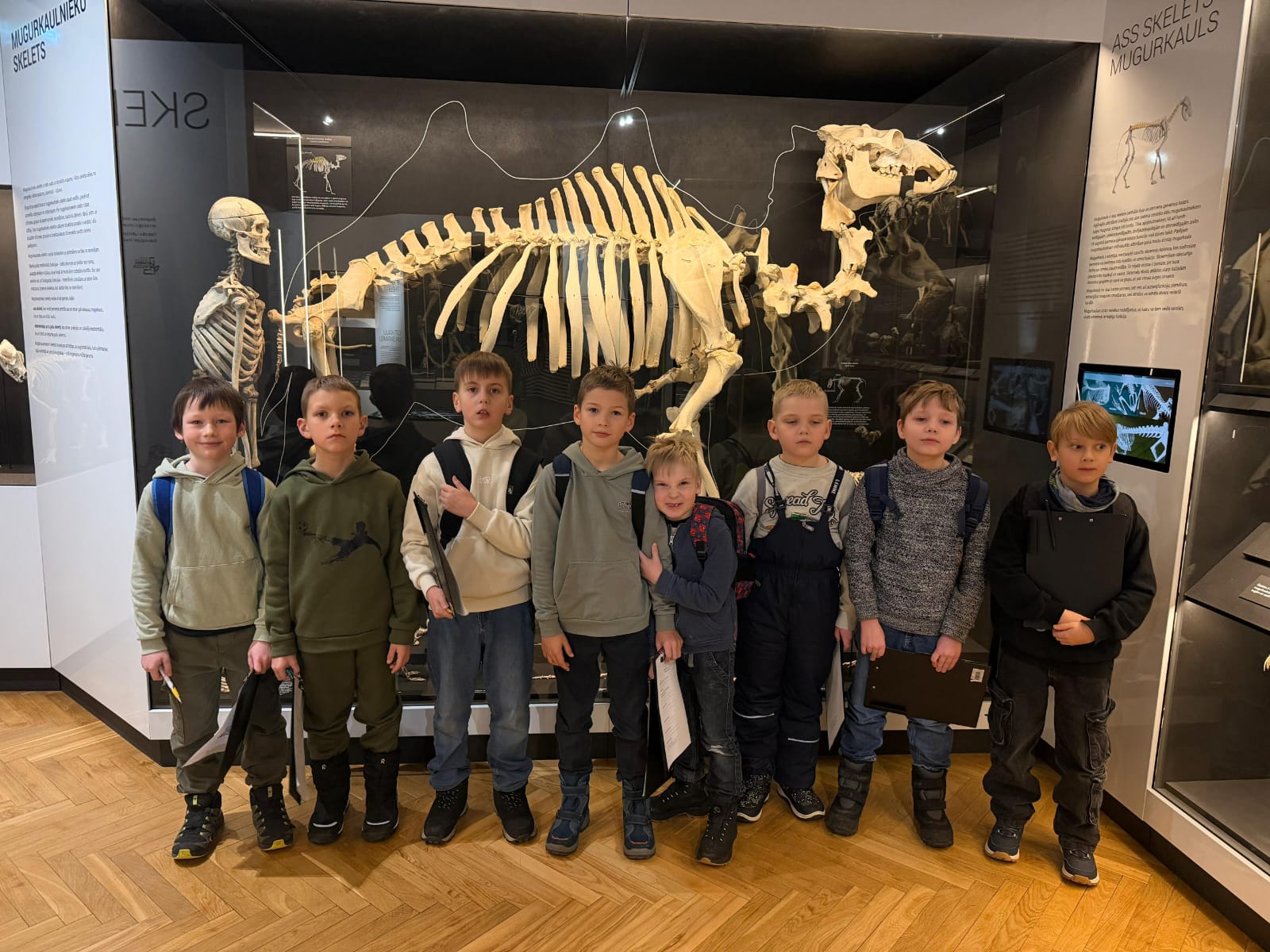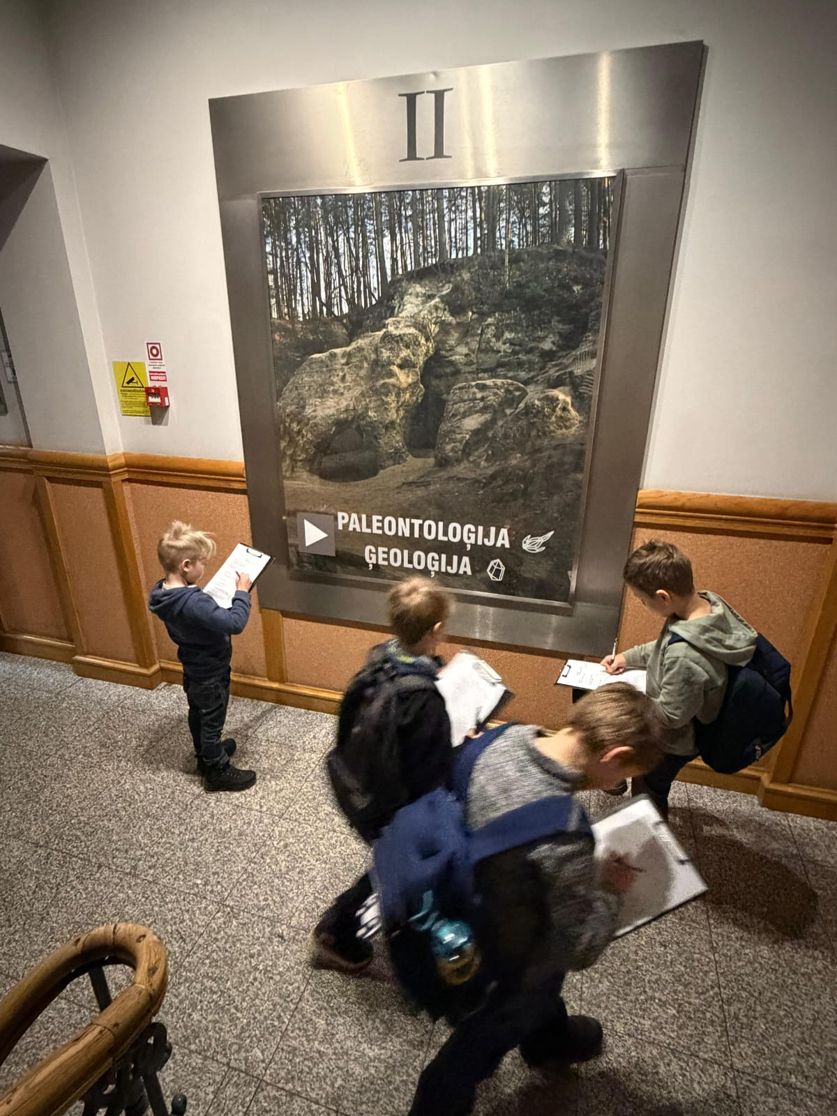 Muzejā bērni iepazinās ar dažādu muzeju veidu atšķirībām un saprata, ka muzejs nav tikai “vieta ar vitrīnām”, bet gan vieta, kur pēta, glabā un stāsta stāstus par mūsu pasauli. Nodarbībā skolēni mācījās šķirot priekšmetus, domājot par to, kur tie iederētos — zooloģijas, botānikas, entomoloģijas vai citos muzeja krājumos. Īpašu interesi izraisīja uzdevums atšķirt akmeņus no bruņuzivju pārakmeņojušajām bruņām, kuras Latvijā sastopamas dažādos atsegumos pie saldūdens. Bērni bija pārsteigti uzzinot, ka šādi atradumi slēpj vairāk nekā 350 miljonu gadu senus stāstus.