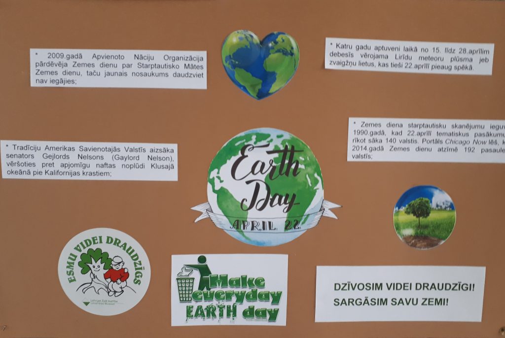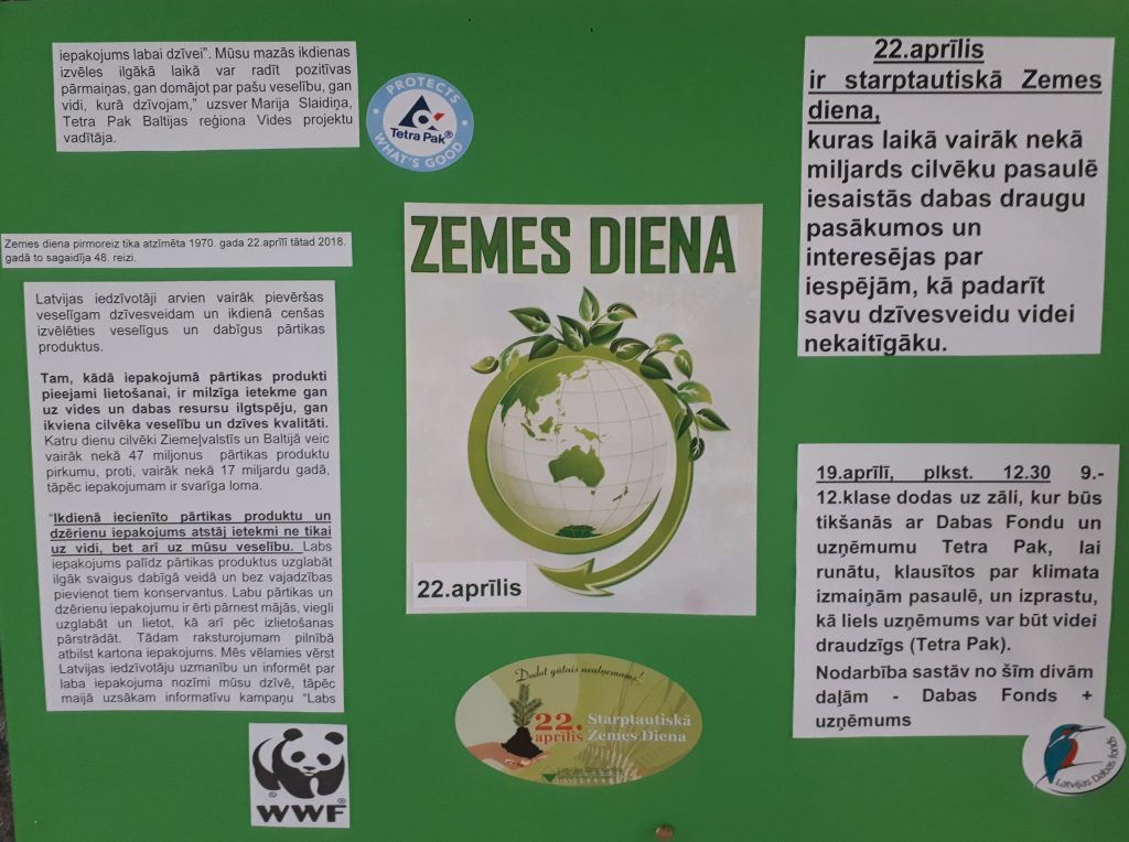 22.aprīlī lielā daļā pasaules valstu tiks atzīmēta starptautiskā “Zemes diena”. Salacgrīvas vidusskolas ekopadome aicina ikvienu padomāt par saviem ikdienas ieradumiem un to ietekmi uz apkārtējo vidi. Kāpēc ir tik svarīgi nenomest zemē atkritumu papīrīti? Kāpēc labāk uz veikalu doties ar savu auduma iepirkumu maisiņu? Kāpēc izvēlēties ekoloģisku pārtiku? Šie ir tikai daži no jautājumiem. Mēs uz zemes neesam vieni. Mūsu rīcība ietekmē apkārtējo vidi, dzīvnieku, putnu un augu sugas. Padomā, pirms rīkojies. 🙂
