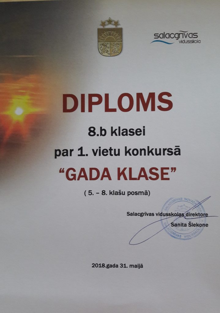 2017./2018. mācību gadā gada klases titulu ieguva 8.b klase un dāvanā saņēma dāvanu karti 150 eiro vērtībā, lai apmaksātu transporta izdevumus ekskursijai!