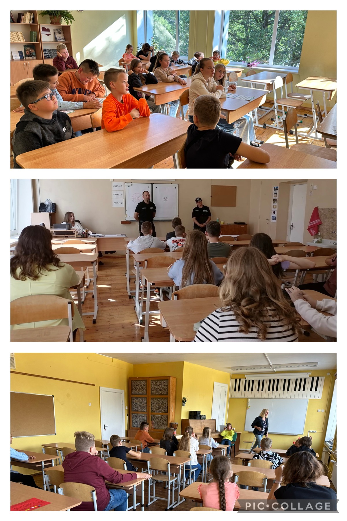 Īpaša stacija bija “Drošība uz ceļa”. Ne katru dienu iznāk tik laba saruna ar pašvaldības policijas pārstāvjiem, PALDIES! Tātad ķiveres velobraucējiem obligāti jālieto līdz 12 gadu vecumam, jābūt velobraucēja apliecībai. Ar “skūteriem un rolleriem” drīkst braukt no 14 gadu vecuma, ja ir iegūta vadītāja apliecība. Uz ielas bez pieaugušā var atrasties līdz plkst. 22.00, svešos privātīpašumos iet nedrīkst! Vecāko klašu skolēni apdomāja nopietnākus jautājumus, darbības un atbildību par to. No visām nelaimēm sevi pasargāt vari tikai TU PATS!