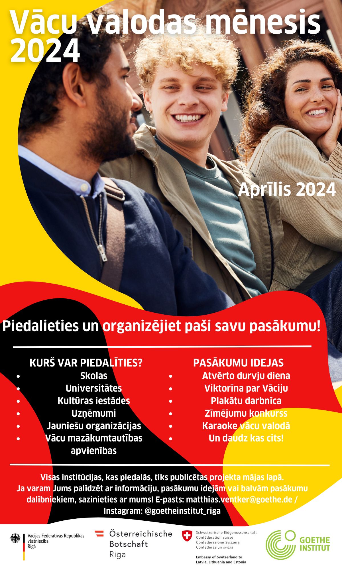 Trīs vāciski runājošo valstu – Vācijas, Austrijas un Šveices vēstniecības, Gētes institūts un citas vāciski runājošās institūcijas Rīgā 2024. gada aprīlī organizē Vācu valodas mēnesi ar vērienīgu pasākumu klāstu visā Latvijā: 5 nedēļās 60 pasākumi 20 pilsētās.
