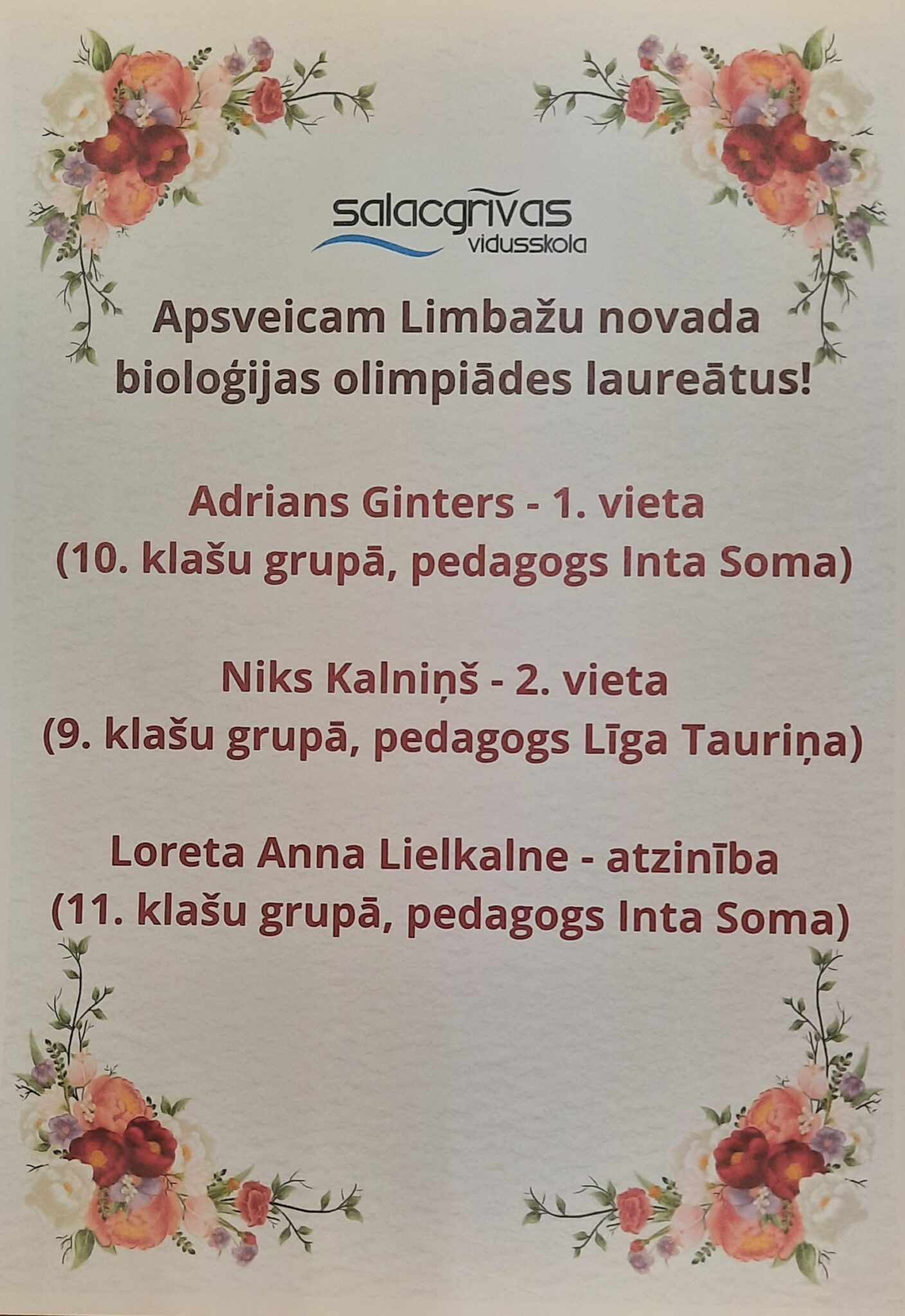 APSVEICAM Limbažu novada 9.-12. klašu bioloģijas olimpiādes Salacgrīvas vidusskolas laureātus un viņu pedagogus ar augstajiem sasniegumiem!