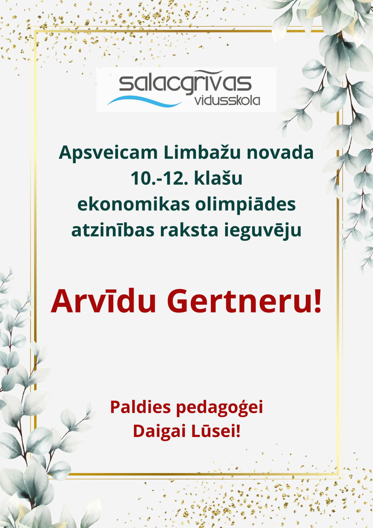 APSVEICAM Salacgrīvas vidusskolas 12.D klases skolnieku Arvīdu Gertneru ar iegūto atzinību Limbažu novada 10.-12. klašu ekonomikas olimpiādē!