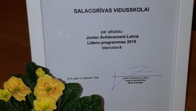 Salacgrīvas vidusskola saņēmusi pateicības rakstu no “Junior Achievement Latvia” par atbalstu, īstenojot Līderu programmu 2019. Paldies Kristai Muciņai, kura pārstāvēja mūsu skolu šajā