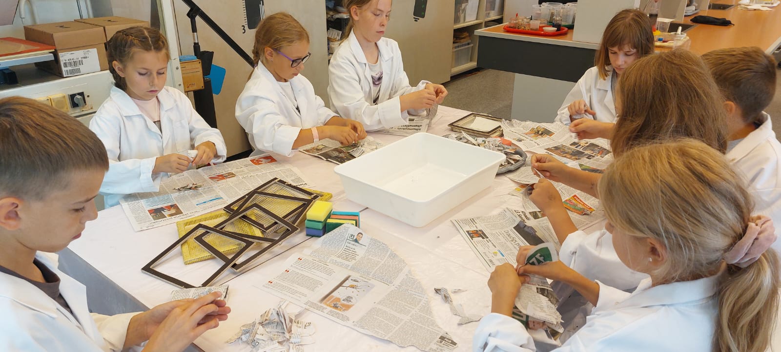Nodarbībā skolēni analizēja materiālu īpašības un veica papīra pārstrādes eksperimentu – sasmalcināja veco papīru, izveidoja masu un izgatavoja papīru.