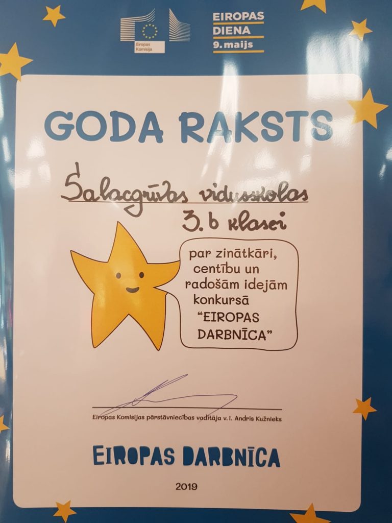 Atzīmējot 9.maijā Eiropas dienu, 1.- 4.klasēm tika izsludināts konkurss “Eiropas darbnīca”. Konkursa uzdevumi mudina skolēnus būt zinošiem un aktīviem, kā arī pilnveido izpratni par ikviena iedzīvotāja lomu Latvijas, Eiropas un pasaules līdzveidošanā.