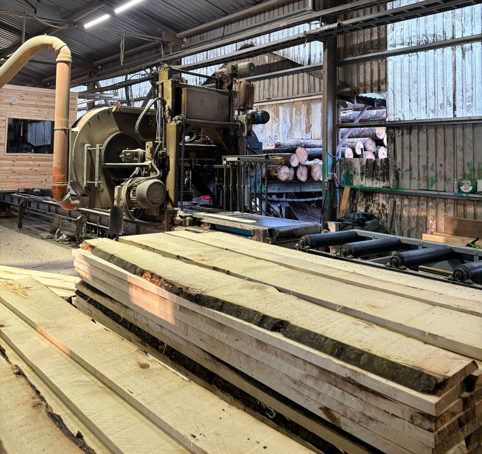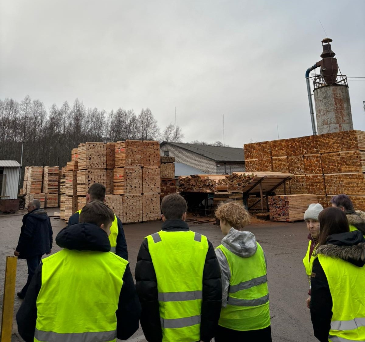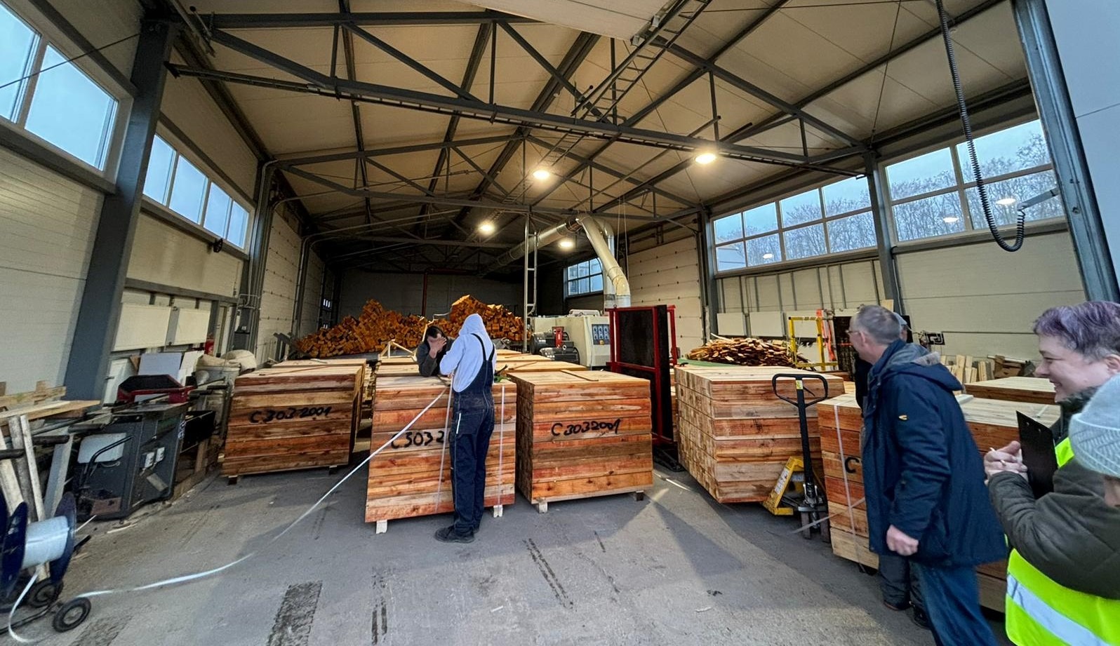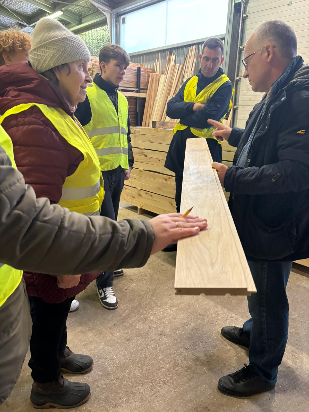Ekopadomes pārstāvjiem bija iespēja redzēt baļķu apstrādes procesu. Baļķus zāģē ar augstākās kvalitātes tērauda lentu, kura slīd ar ātrumu 40 m/s. Darbinieks sadala dēļus atbilstoši kvalitātei un tālāk tie tiek žāvēti kamerās, kurās ir 60 °C temperatūra. No baļķu serdēm saražo 1000 m3 mēnesī palešu dēļus.