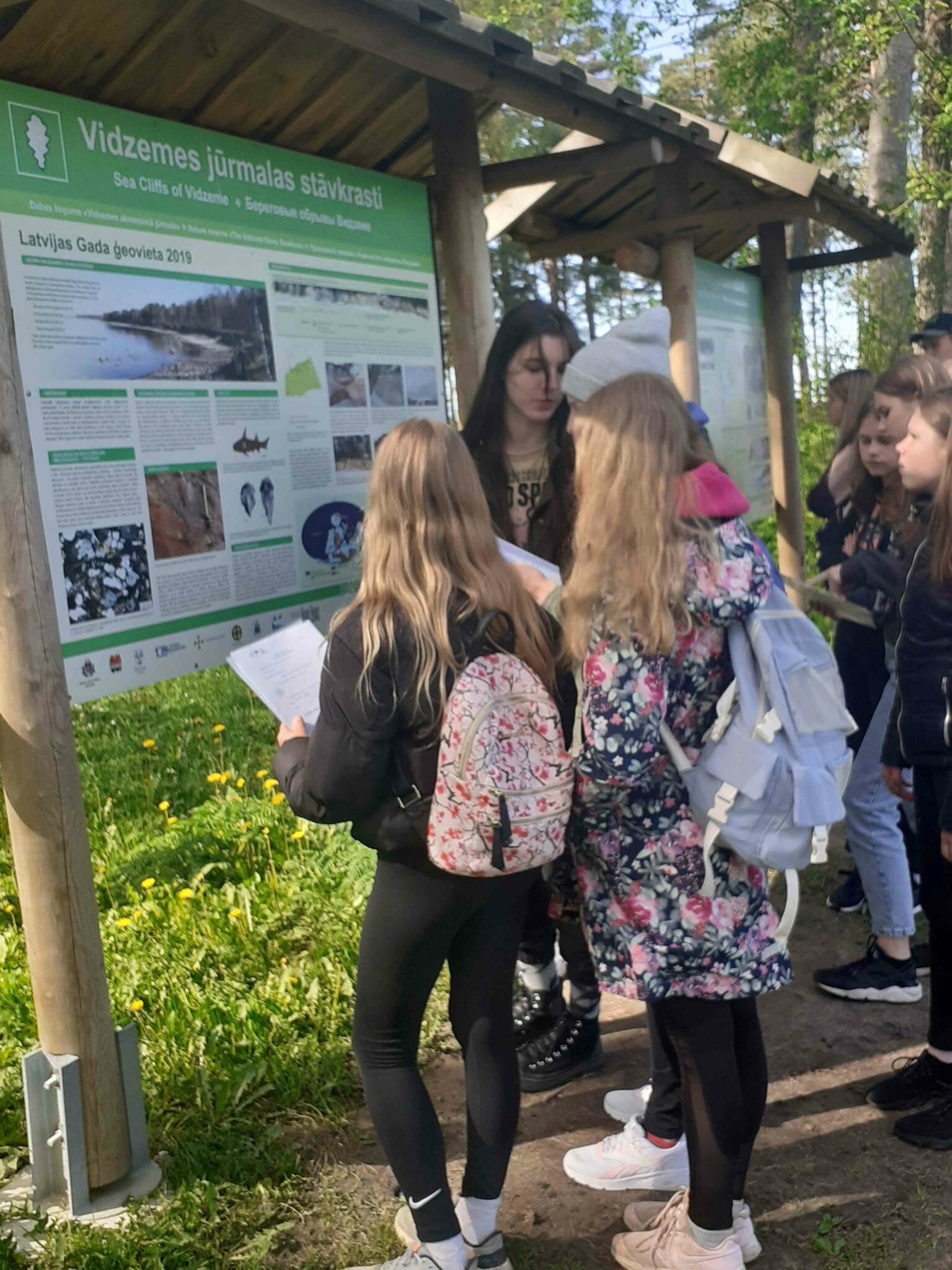 Pārgājienu sākām pie Veczemju klintīm, kur uzzinājām, ka tās ir iespaidīgākā un krāšņākā klinšu grupa Vidzemes piekrastē. Tas ir līdz 6 metru augsts stāvkrasts, kur vairāku metru garumā atsedzas sarkanas smilšakmens klintis ar seklām alām, nišām, grotām un citiem veidojumiem.