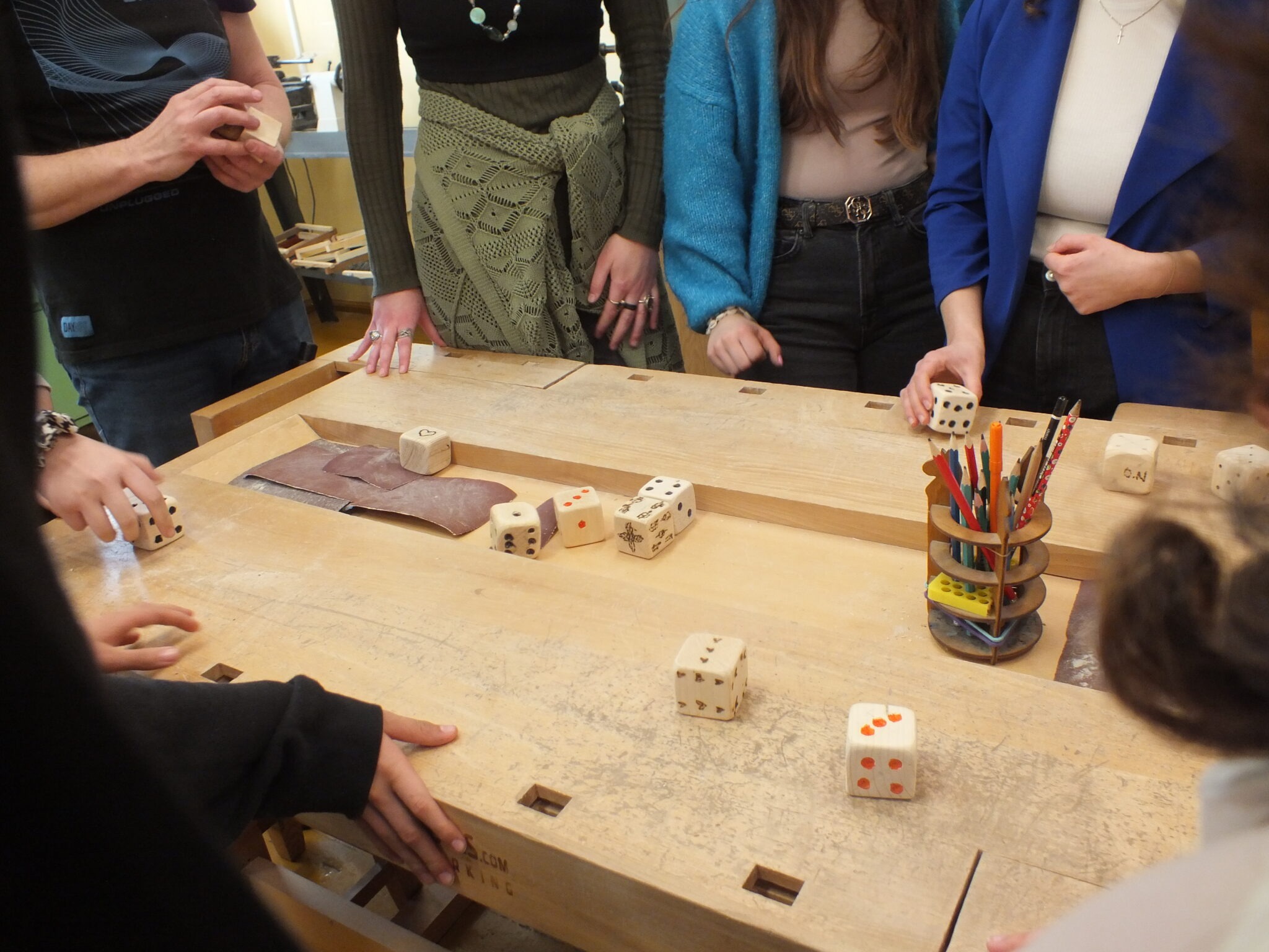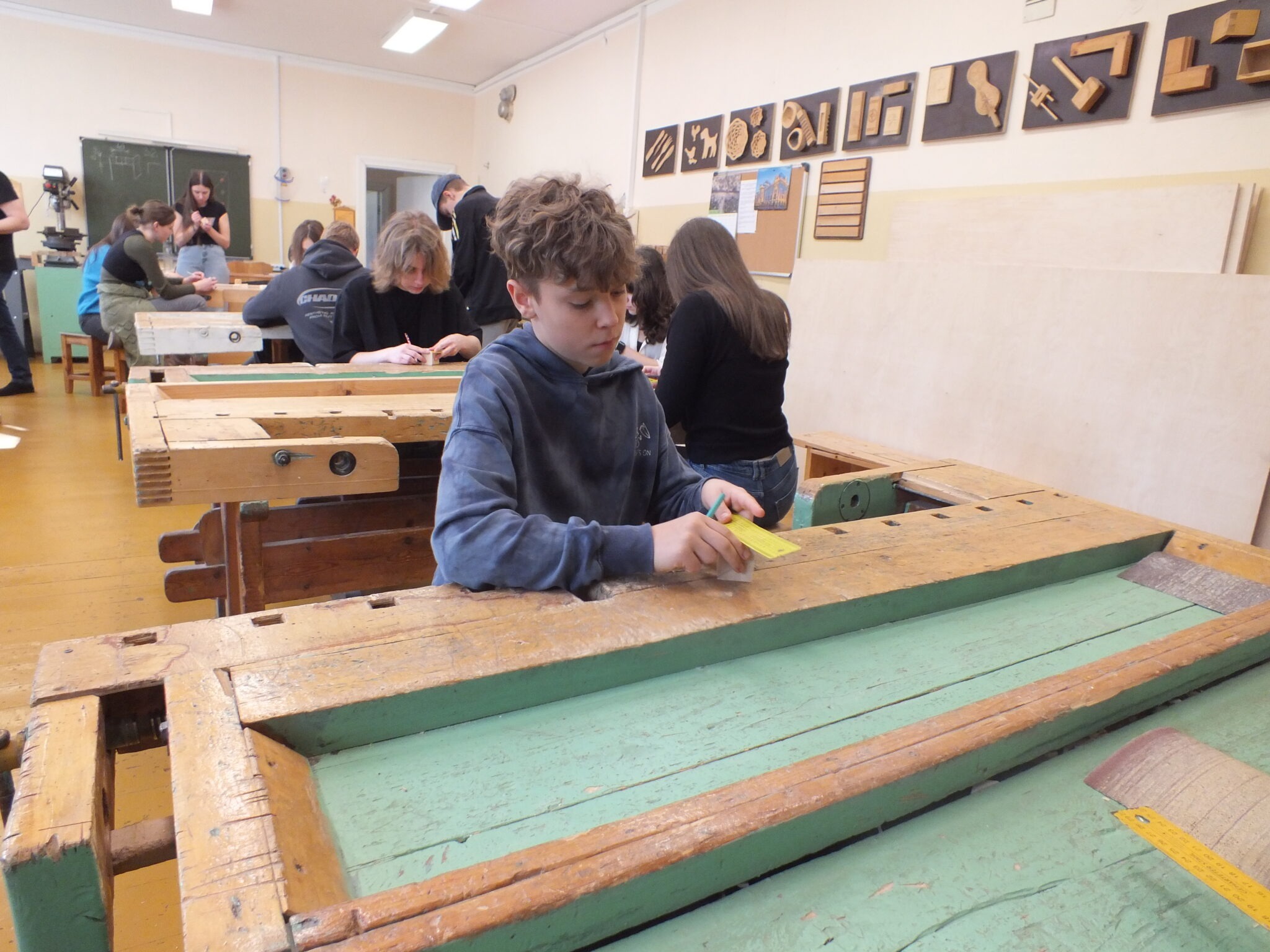 Skolā turpinājās mūsu darbošanās, vispirms skolēni skolotāja Guntara Ūdra vadībā izgatavoja no koka metamos kauliņus. Paldies dizaina un tehnoloģiju skolotājam Guntaram Ūdrim!