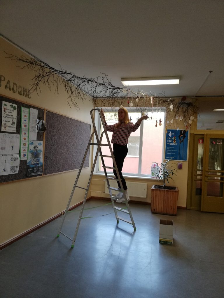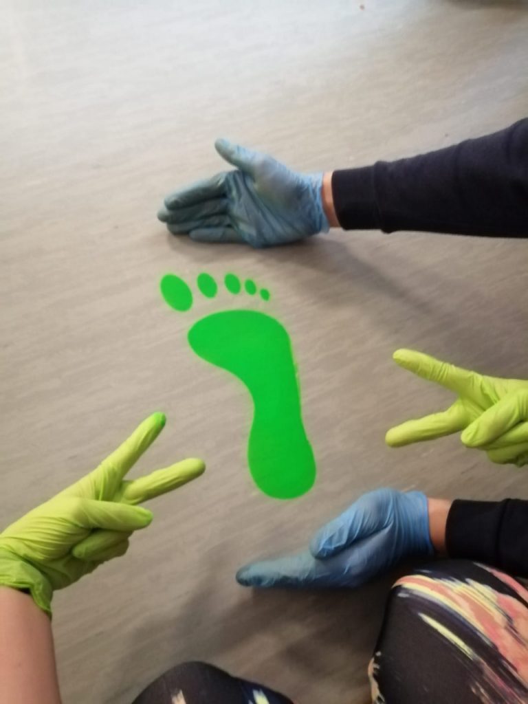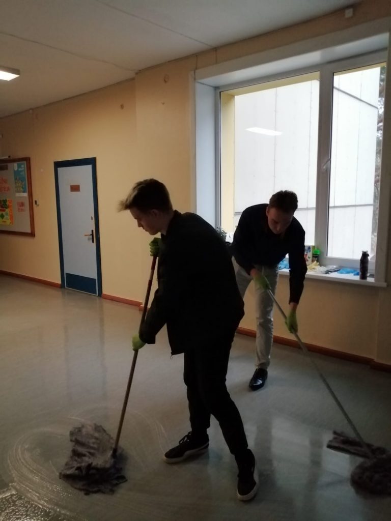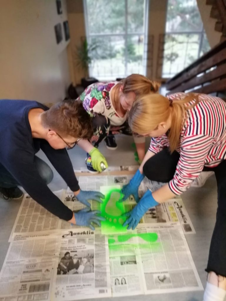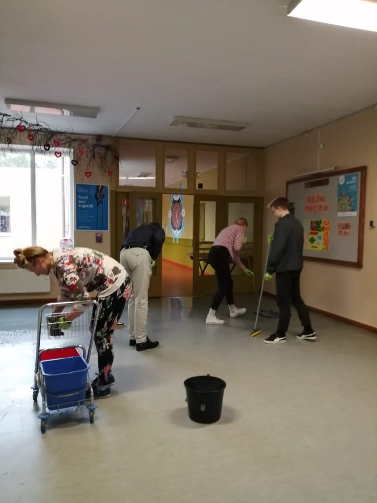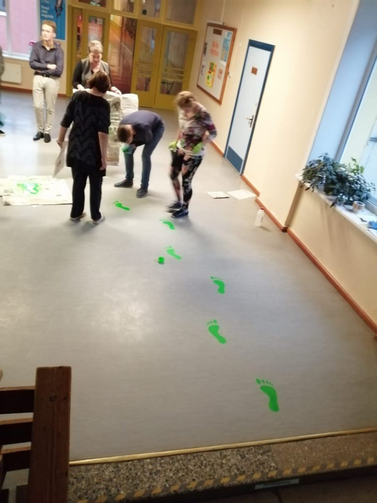 Labiekārtošana sākās ar Ziemassvētku rotājumu noņemšanu. To vietā pielikām skaistas, no dažādu krāsu dzijas veidotas sirsniņas. Skolas logā tika uzrakstīts sauklis “Maini sevi, nevis klimatu!”. Tad ķērāmies klāt dienas svarīgākajam uzdevumam – pēdiņu krāsošanai. Cilvēkiem būs lielāka vēlme pieiet pie dēļa, ja uz to vedīs uz grīdas uzkrāsota pēdiņu “taciņa”. Bet, lai pēdiņas uzkrāsotu, vispirms grīda ir jāsagatavo krāsai. Tā kā uz linoleja bija vaska kārtiņa, kas veicinātu ātrāku krāsas nolobīšanos, tad ar speciālu līdzekli un birstēm skolēni attīrīja grīdu. Darbs nebija viegls, tāpēc ik pa brītiņam skolēni mainījās pienākumiem. Ar nepacietību gaidījām, kad grīda beidzot nožūs, lai ķertos krāsošanas. Saņēmuši instruktāžu no skolas meistara, kā darboties ar krāsas baloniņu, varējām sākt krāsot pēdiņas, izmantojot iepriekš pagatavotos šablonus.