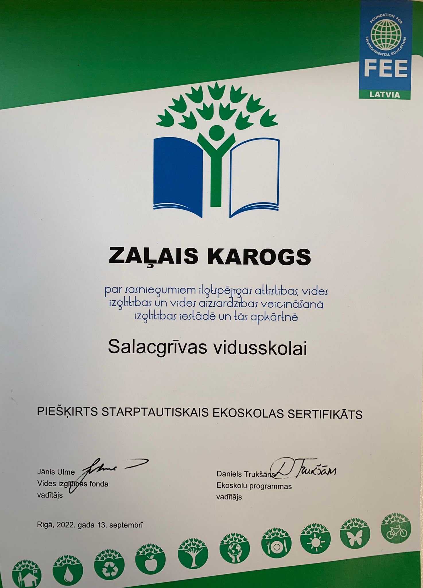 13. septembrī Salacgrīvas vidusskolas ekopadomes pārstāvji Adrians Ginters un Tīna Keita Paegle Latvijas Nacionālās bibliotēkas Ziedoņa zālē piedalījās apbalvošanas ceremonijā, skolai 5. reizi saņemot Zaļo karogu. Kā atzina Adrians un Tīna, pasākums bija interesants, atraktīvs. Klātesošos sveica Ekoskolu vadītājs Daniels Trukšāns, bet pasākumu vadīja Kozmens. Skolēniem patika, ka apbalvošanas ceremonijas laikā bija improvizācijas teātra miniizrādes par aktuālām vides tēmām.