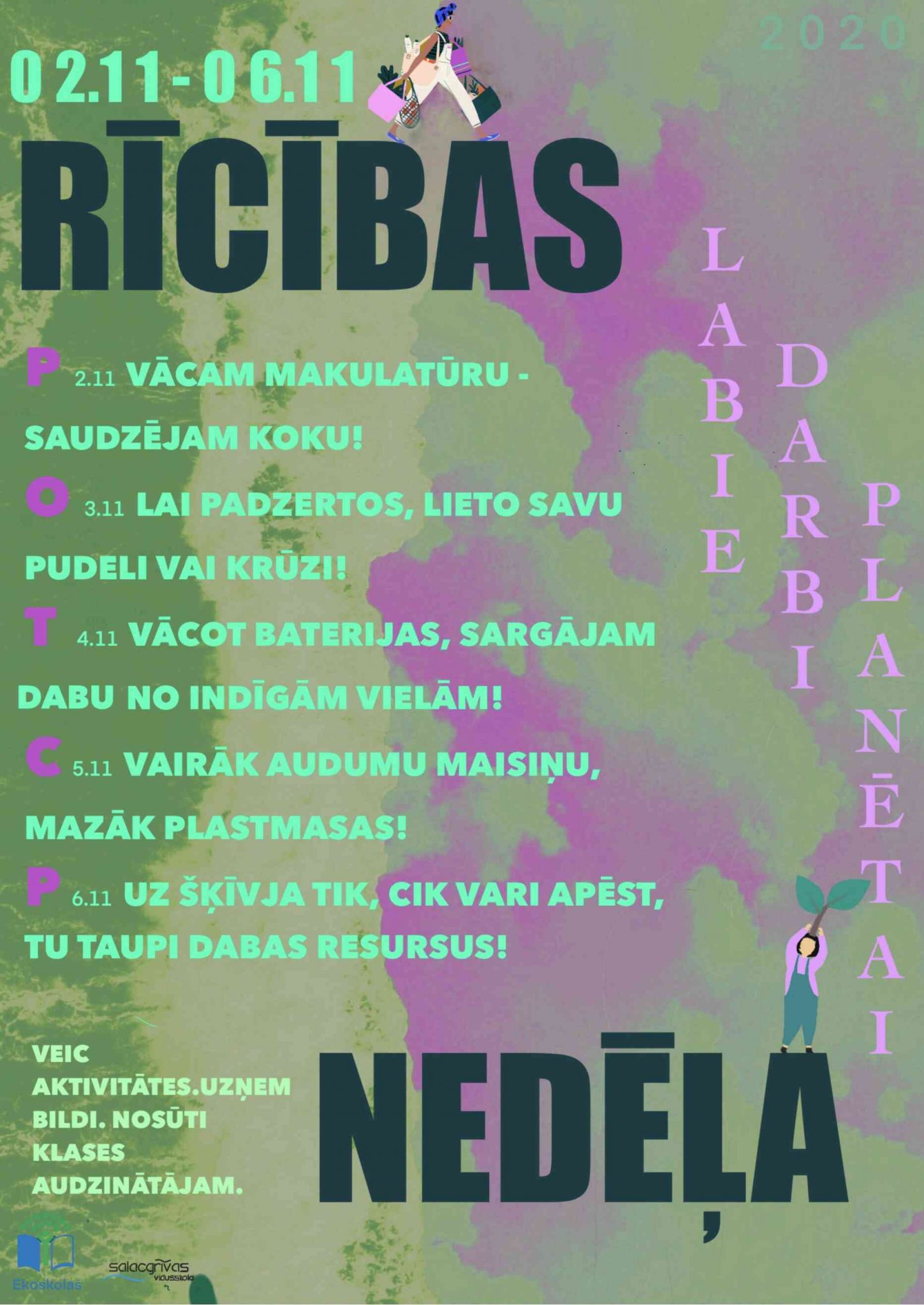 2) uzņemam foto, kur redzama jūsu aktivitāte (piemēram, foto kopā ar sanestajām makulatūras pakām, vai visi kopā ar esošajām vienreizlietojamām ūdens pudelēm, utt.). Tie, kas ir attālināti, arī var sevi bildēt ar makulatūras paku, ko vēlāk atnesīs uz skolu, vai dodoties uz veikalu ar savu auduma maisiņu, utt.).