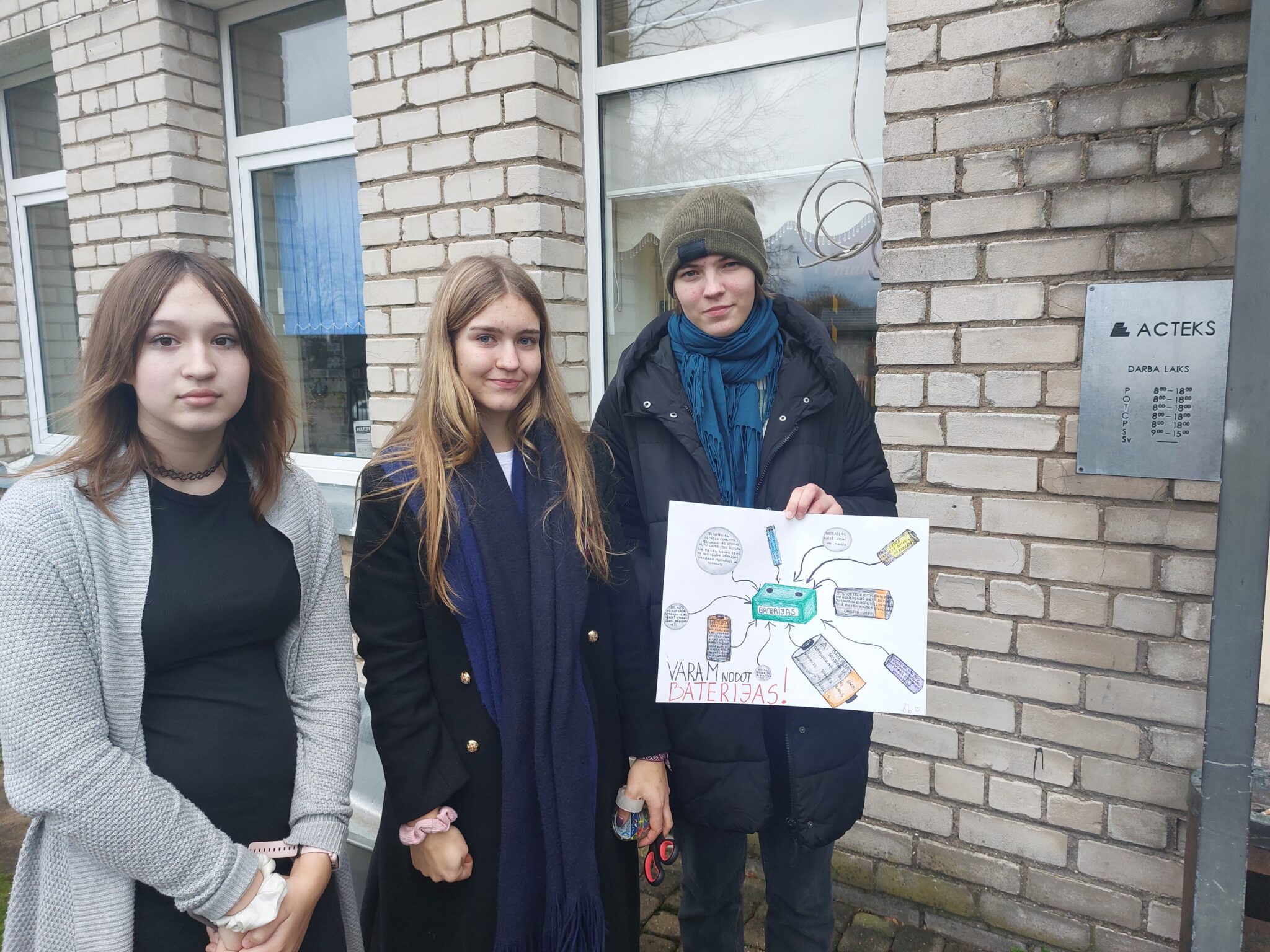 8.b klases skolēni izveidoja plakātu “Varam nodot baterijas!” Viņi atzīst, ka izlietotās baterijas ir vidēji bīstami atkritumi. 8.b klases skolēni saprata, cik svarīgi baterijas ir neizmētāt, jo to sastāvā ir kodīgas skābes un smagie metāli. ‘’Mūsu klasē ir prasmīgi skolēni – mākslinieki, ideju ģeneratori un palīgi –, tādēļ ir viegli izveidot plakātus.”