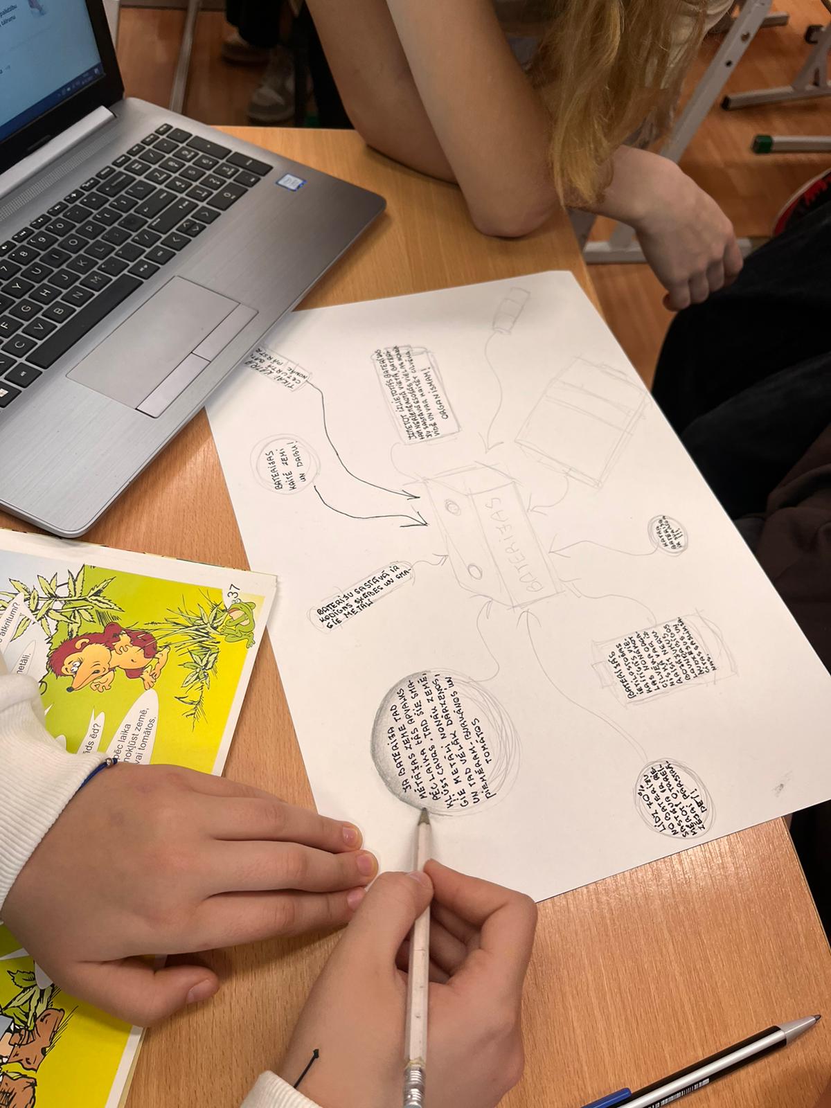 - Sarunu gaitā skolēni izteica savu viedokli un izspēlēja lomu – sižeta spēles, kas attēlotas fotogrāfijās – Kā varētu taupīt un lietderīgi izmantot papīru?