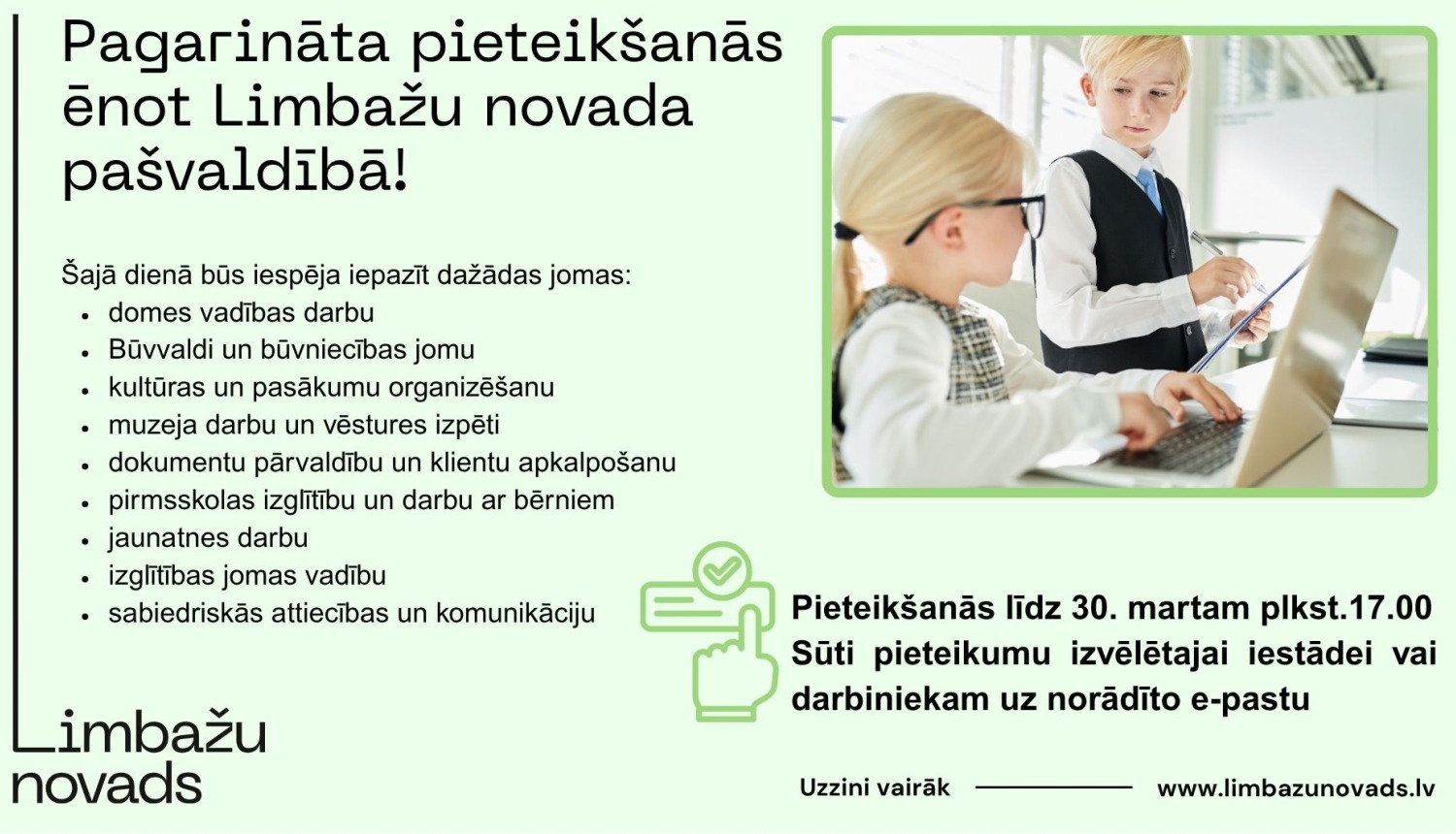 Neatkarīgi no tā, vai Tevi interesē vispārējā novada pārvaldība, darbs ar cilvēkiem, dokumentiem, bērniem, pasākumiem, projektiem vai komunikāciju – noteikti atradīsi sev saistošu jomu!