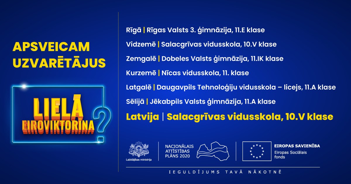 Sociālo zinību skolotāja Inga Čekaļina regulāri iesaista mūsu skolēnus šāda veida spēlēs, viktorīnās, Eiropas eksāmenā, utt. Jau otro gadu pēc kārtas kāda no Salacgrīvas vidusskolas klasēm gūst uzvaru valsts mērogā.