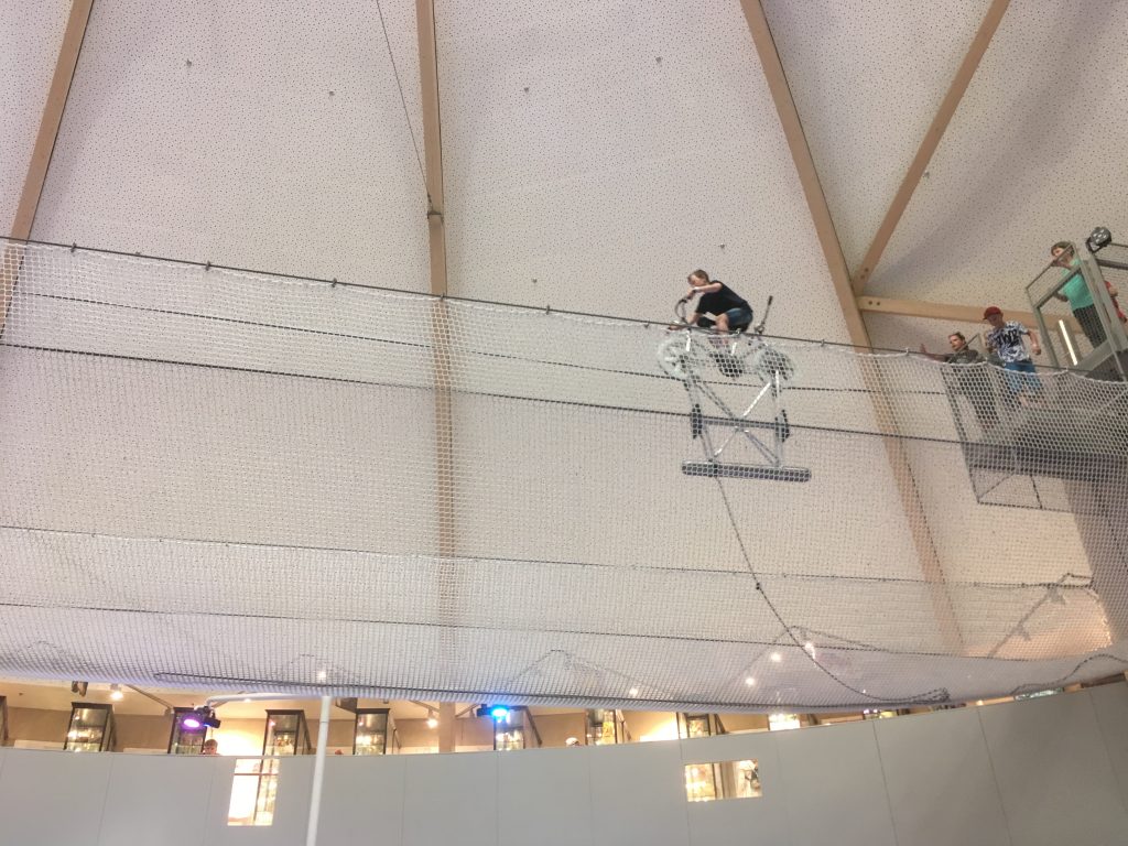 Ne tikai fizikas likumu likumsakarības jāapgūst, vēl ir jāsaņem drosme, lai praktiski izbaudītu braucienu ar velosipēdu augstu gaisā pa trosi.