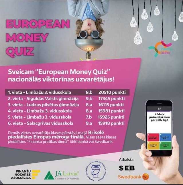 26.martā Latvijas nacionālajā “European Money Quiz” viktorīnas finālā ar labiem panākumiem startējusi Salacgrīvas vidusskolas 9.a klase, 65 klašu konkurencē iegūstot 6.vietu un lielisku iespēju piedalīties Finanšu pratības dienā “Swedbank”, apmeklējot “Finanšu laboratoriju”, kuras mērķis ir veicināt skolēnu izpratni par finanšu jautājumiem un uzlabot Latvijas sabiedrības finanšu pratību ilgtermiņā.