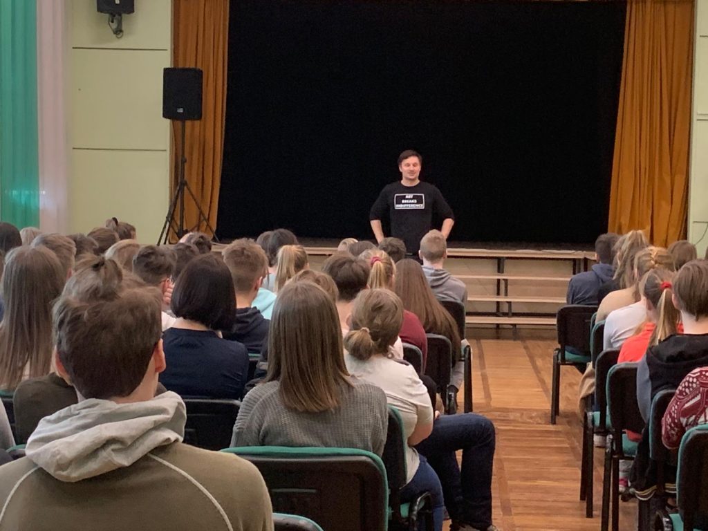 8.aprīlī skolēniem notika ilgi gaidītā tikšanās ar skolas absolventu, aktieri un dzejnieku Andri Buli, kuru neplānotas filmēšanas dēļ februārī nācās atlikt.