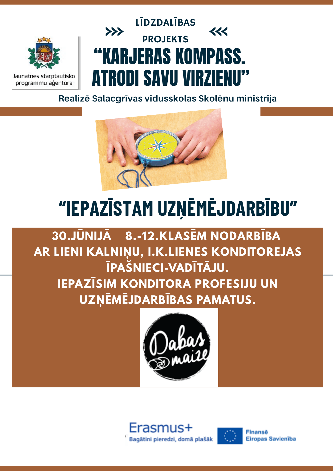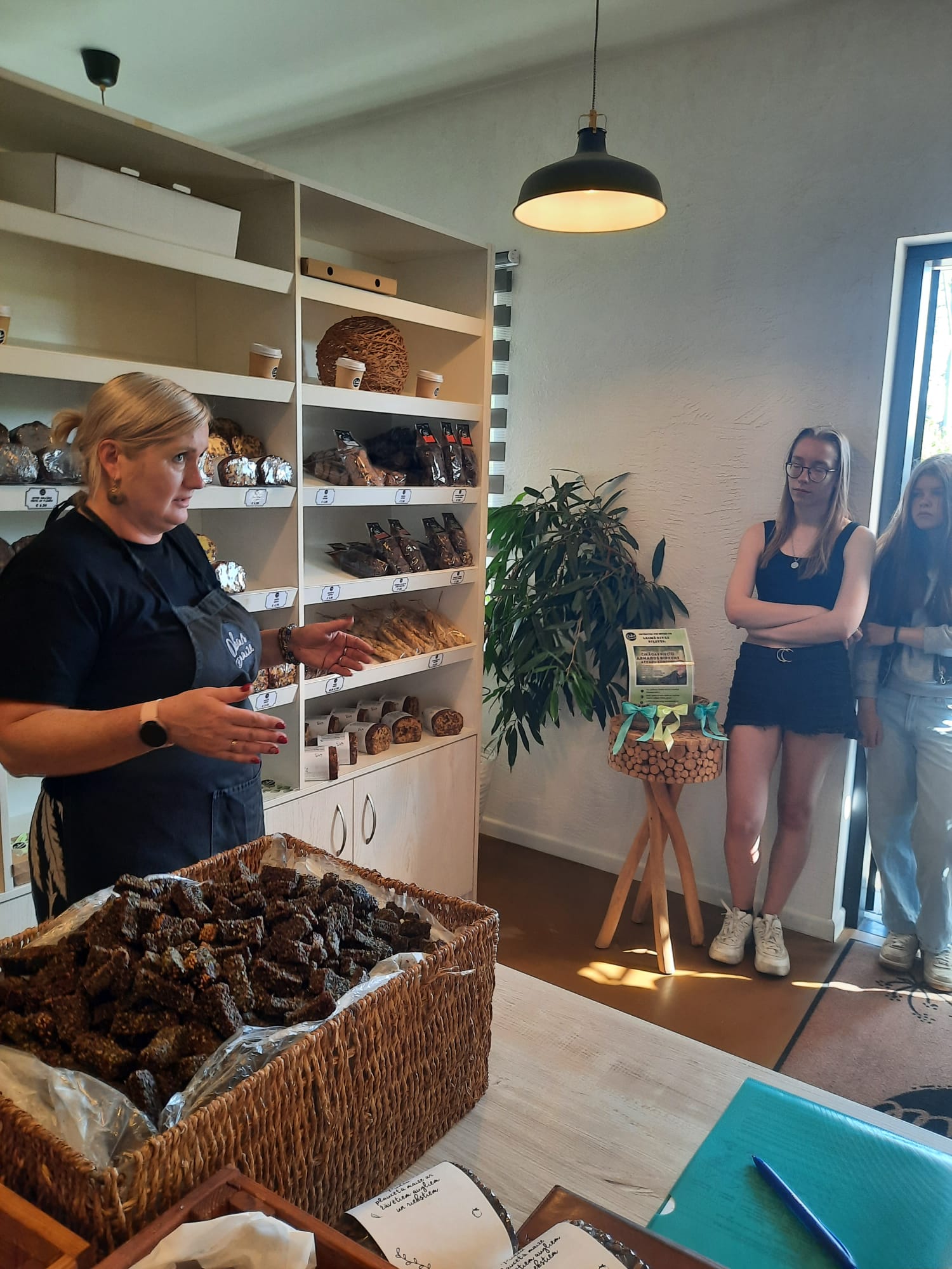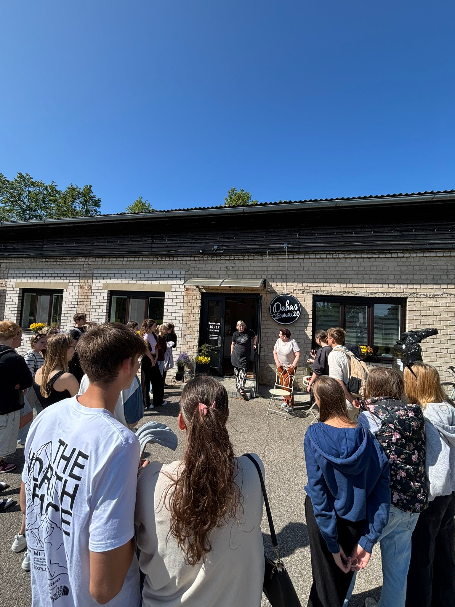 30.jūnija pēcpusdienā skolēnus laipni uzņēma Liene Kalniņa savā uzņēmumā “Dabas maize”. Kuplā pulkā, neskatoties uz vasaras brīvdienām, skolēni noklausījās par uzņēmuma veidošanu, tā izaugsmi, iepazinās ar produkciju. Izrādās, ka uzņēmums sadarbojas ar 60 veikaliem, regulāri apmeklē tirgus visā Latvijā, arī Lietuvā un Igaunijā. Uzzinājām, kā mainās sortiments, kā top jaunas receptes, kā tiek sadalīti darbi uzņēmumā, kuram ir plašas un ērtas telpas, salīdzinot ar pirmo mājvietu. Daudz ko , kā atzina uzņēmēja, viņa iemācījusies caur praksi, sapratusi, kur produkciju labāk pērk, ko vajag mainīt.