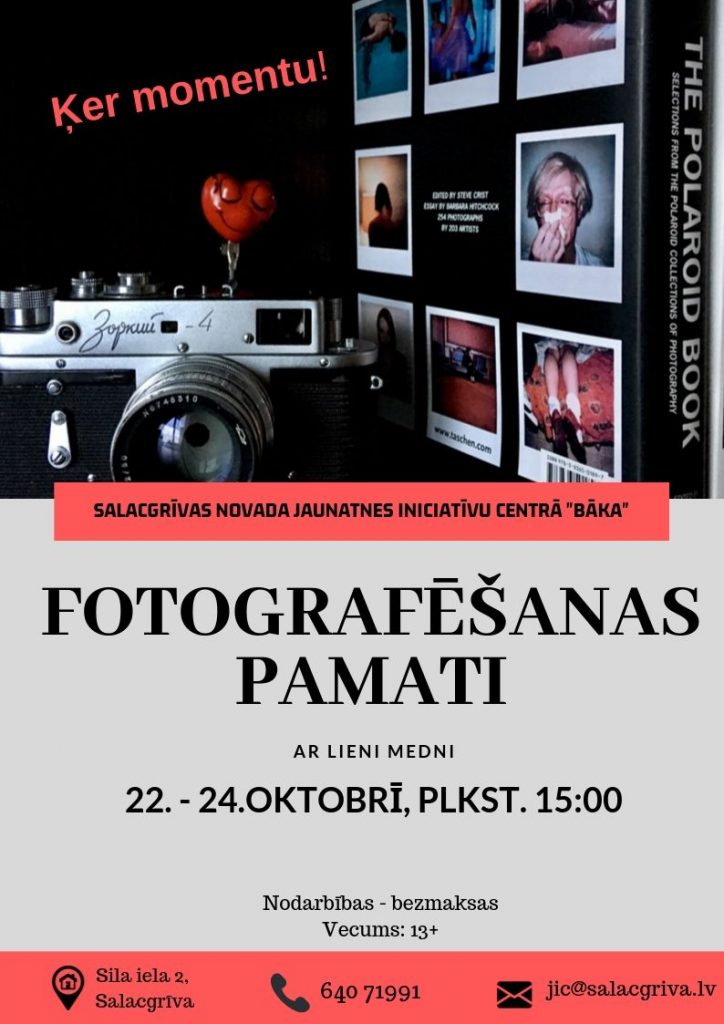 Jaunieti – ieskaties! Salacgrīvas novada jaunatnes iniciatīvu centrā “Bāka” 22.-24.oktobrī iespējams apmeklēt noderīgas bezmaksas nodarbības fotografēšanā – lektores Lienes Mednes vadībā. Izmanto iespēju!