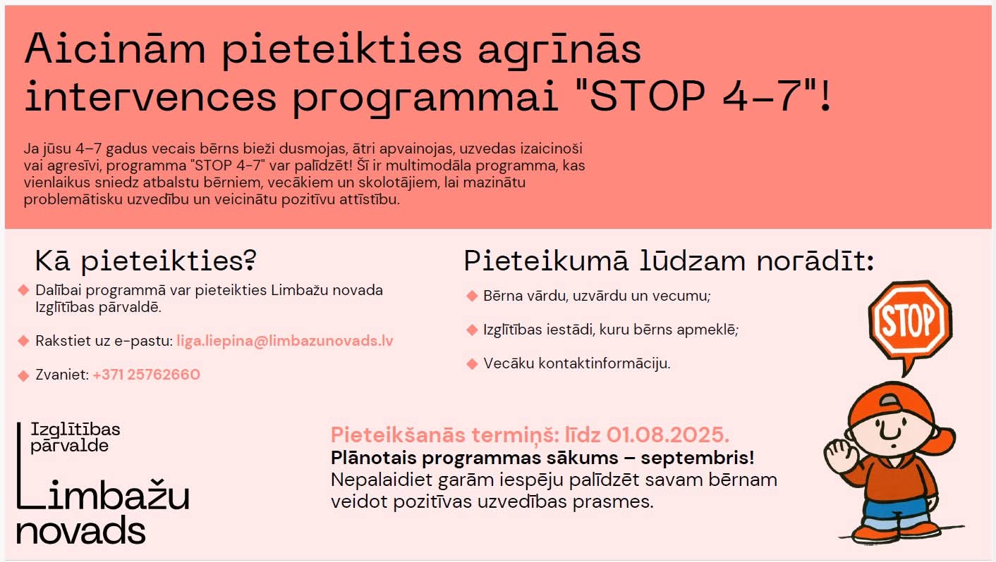 Ja 4-7 gadus vecs bērns bieži sadusmojas, ātri apvainojas, uzvedas izaicinoši vai agresīvi, vecākiem ir iespēja pieteikties agrīnās intervences programmai “STOP 4-7”, lai savlaicīgi sniegtu atbalstu bērniņa izaugsmei.