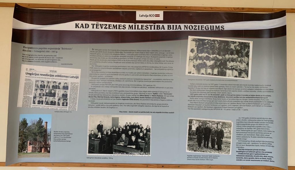 Novembra mēnesī Salacgrīvas vidusskolā ir apskatāma izstāde, ar kuru laipni dalījās Ainažu jūrskolas muzejs “Kad Tēvzemes mīlestība bija noziegums”. Izstāde vēsta par pretpadomju pagrīdes organizāciju “Dzirkstele”, kas darbojās Ainažos 50-s gados. Šobrīd, kad Latvija ir brīva, tik ļoti piemirsies, ka iespēja brīvi izteikt savu viedokli, ka iespēja izdarīt savas izvēles, mūsu tautai nav bijusi vienmēr. Par brīvību mēs varam pateikties tiem drosmīgajiem, kuri nebaidījās runāt, kuri nebaidījās rīkoties pat apstākļos, kad doma par neatkarīgu valsti varēja draudēt ar deportāciju. Kā varoņu piemiņas brīdī Ainažos ir minējusi Iveta Erdmane: “Ainaži ir vieta, kurā 1957.gadā tika uzvilkts Latvijas karogs. To izdarīja deviņi drosmīgi, bezbailīgi puiši nebaidīdamies ne no kā. Tā toreiz bija liela drosme, cituprāt pārgalvība, neapdomība. Visus garos okupācijas gadus Latvijā bija cilvēki, kuri dažādos veidos cīnījās pret padomju varu. Ainažos jau 1953. gadā Velta Rolmane, lai izjauktu vēlēšanas, bija izspraudusi pretpadomju skrejlapas. Vai šodien mēs varētu brīvi stāvēt paši savā valstī, ja šādi cilvēki nebūtu bijuši? Vai tikai uz barikādēm padziedot mēs būtu brīvu Latviju dabūjuši? Pilīti pa pilītei viņa mums tika iegūta. Šie puiši bija pirmās brīvības bezdelīgas mūsu pusē. Jau sākot pretpadomju darbību puiši apzinājās, ko dara un gatavojās sliktākajam iznākumam – cietumam. Viņus visus arī izsūtīja uz vietu, kur dienas pilēja lēni un ļauni. Viņi nesa upuri, nesa krustu ne sev, bet mums visiem, pateicoties viņu ciešanu upurim, varēja tapt brīva Latvija. Iedegsim sveces šo mūsu deviņu drosmīgo puišu piemiņai: Mārim Buliņam, Rainim Radziņam, Mārtiņam Strautam, Bruno Tītam, Guntim Tamboram, Johanam Kukam, Jurim Sārtam, Jurim Jirgenam un Arnoldam Elstiņam.”