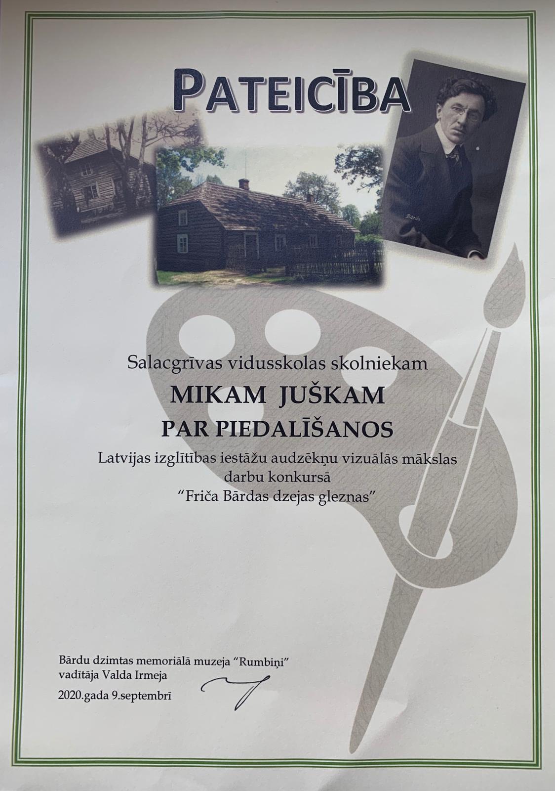 2.b klases skolnieks Miks Juška piedalījās zīmējumu konkursā | Friča Bērdas dzejas gleznas”, par ko saņēma arī pateicību.