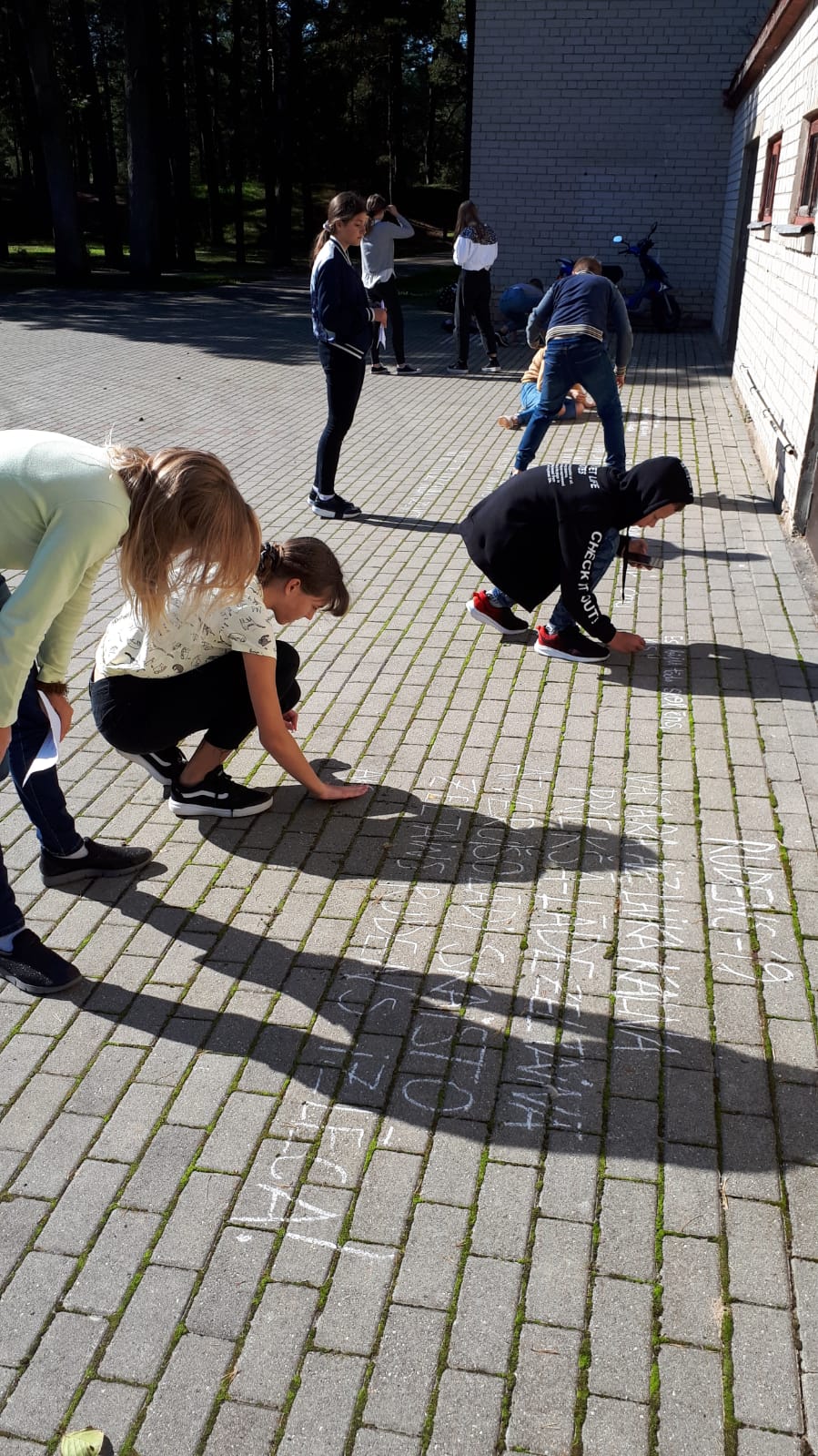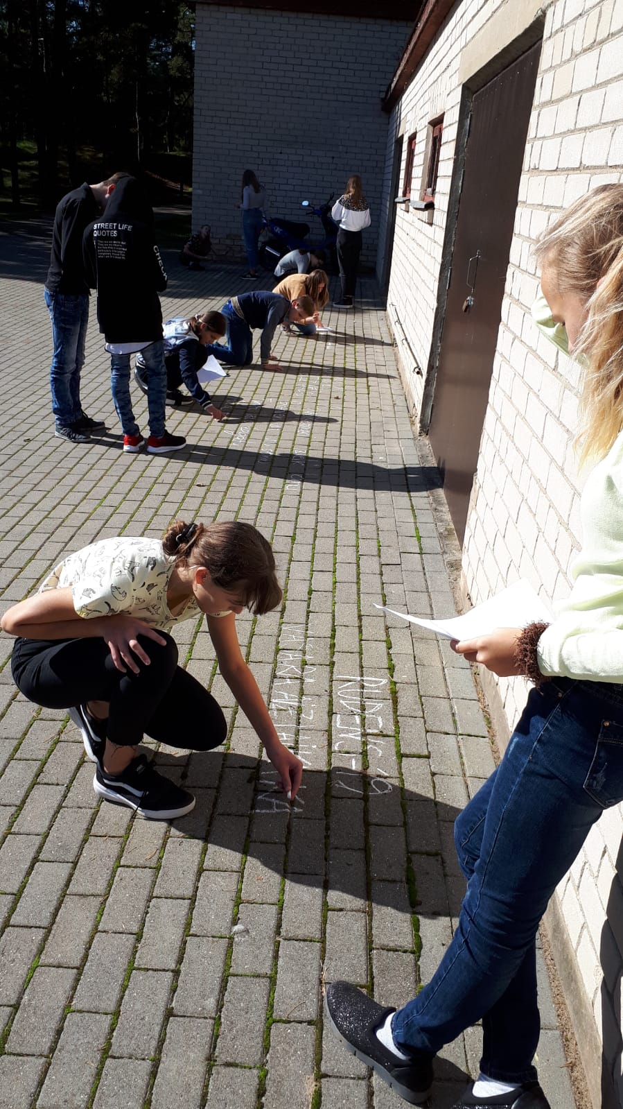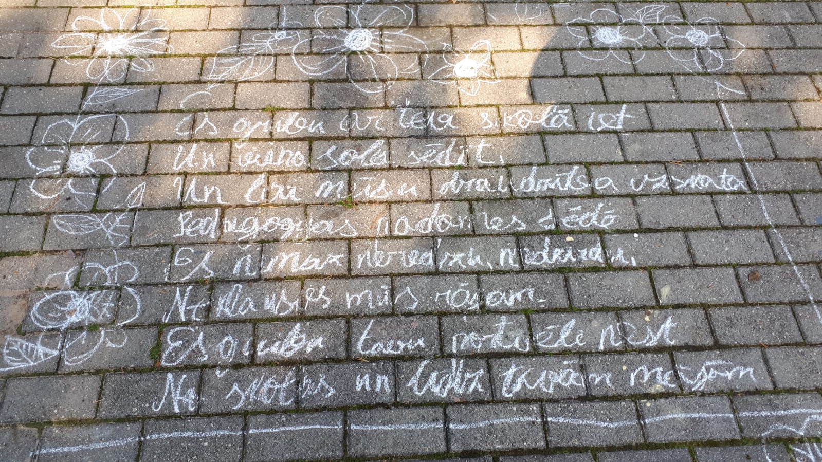 7.a klase ar klases audzinātāju G.Ūdri devās ārā un rakstīja uz bruģa gan dzejnieku, gan pašu sacerētus dzejoļus.
