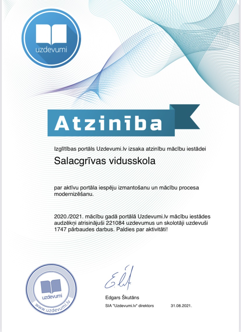 Skolotāju un skolēnu aktivitātes rezultātā Salacgrīvas vidusskola ir kļuvusi par vienu no aktīvākajām skolām portālā Uzdevumi.lv 2020./2021. mācību gadā!”