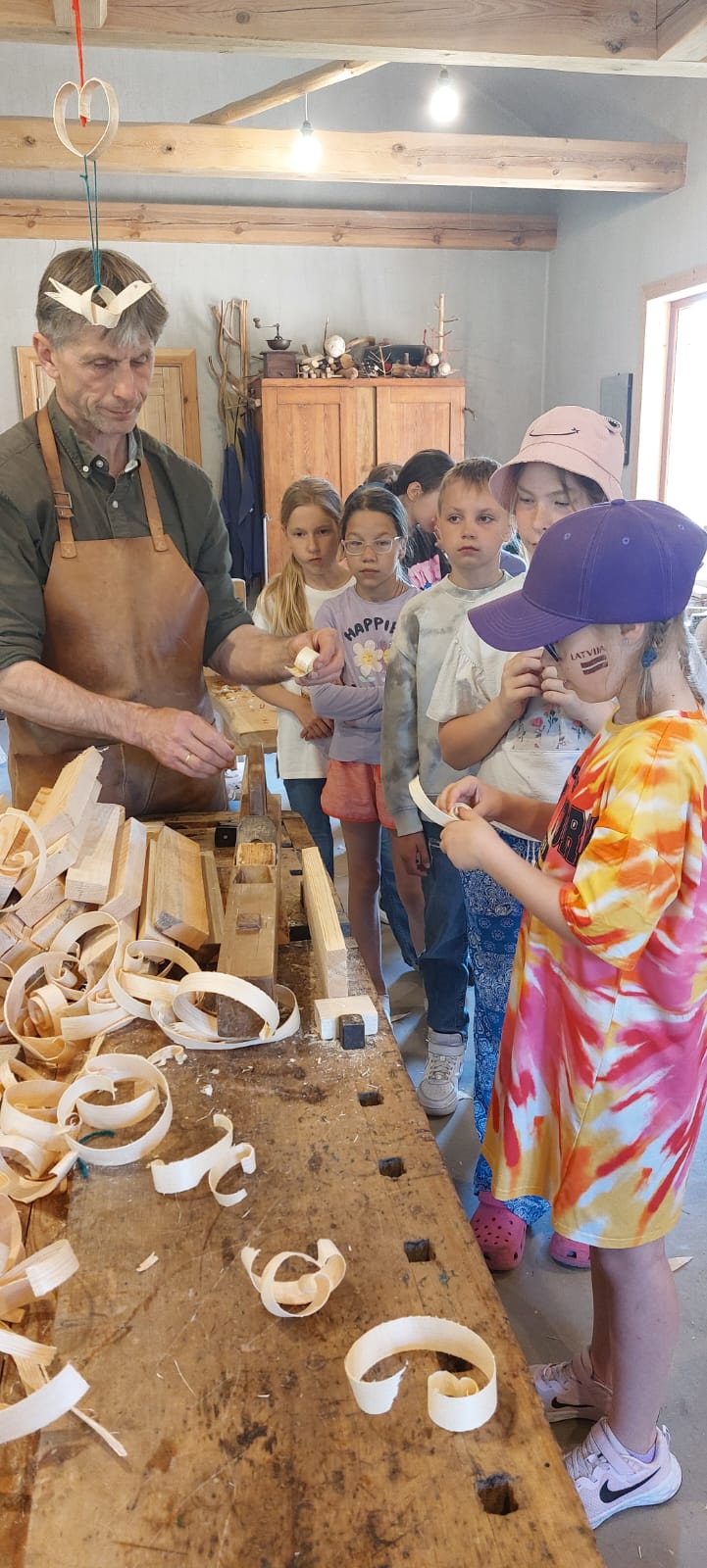 Darbojoties kopā ar pieredzējušiem meistariem – kokamatniekiem, skolēni iepazina klasiskos koka apstrādes darbarīkus – divroku zāģi, ēveli, slīmestu. Katrs pagatavoja no ēveles skaidas putnu un sirsniņu.