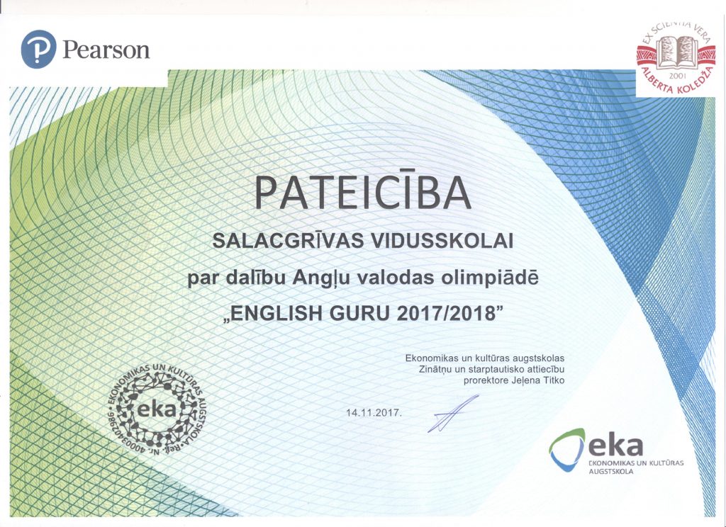 Amanda saņēma EKA pateicību un sertifikātu par dalību EKA angļu valodas olimpiādē “English Guru”. Pateicību par dalību šajā olimpiādē saņēma arī Salacgrīvas vidusskola.
