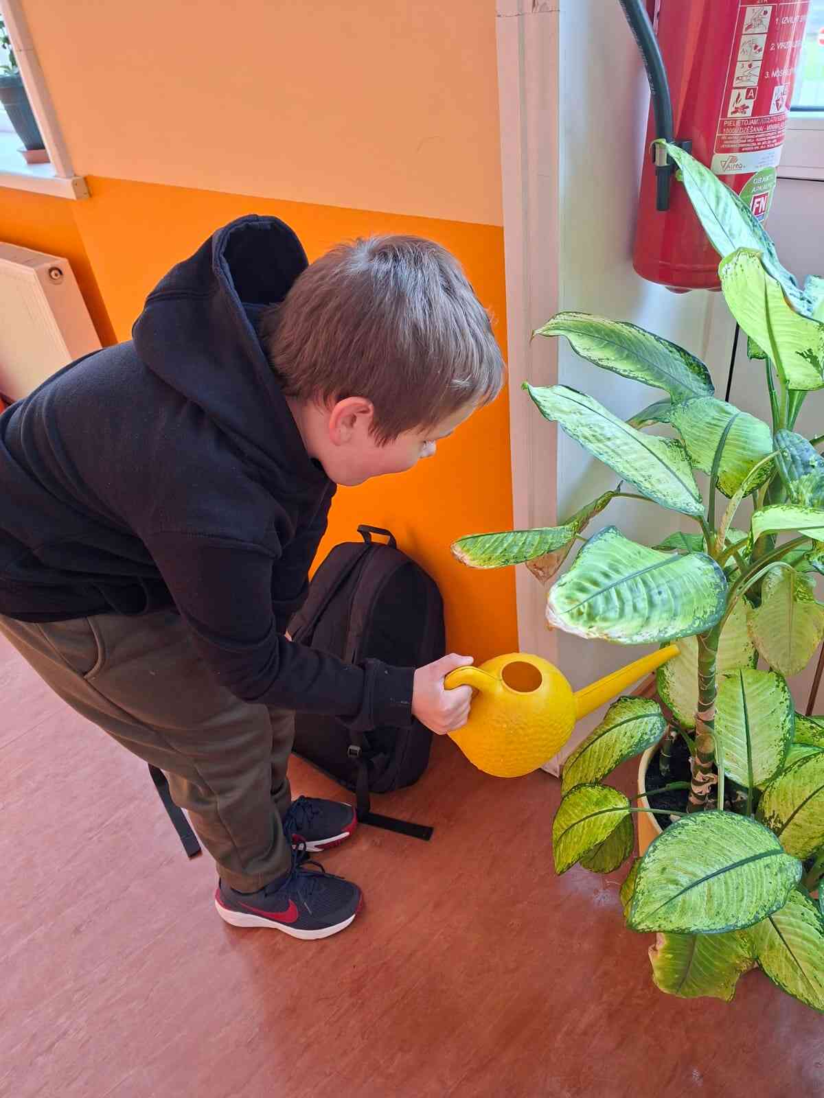 Salacgrīvas vidusskolas 2. c klase kā labo darbu, bija izvēlējušies telpaugu laistīšanu otrā stāva gaitenī.