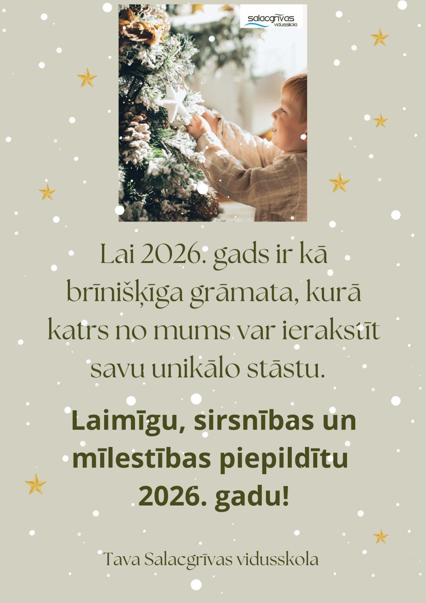 Lai katra Jaunā gada diena nes tikai laimes mirkļus, kas sasilda sirdi, dāvā ticību labajam un drosmi piepildīt savus sapņus!