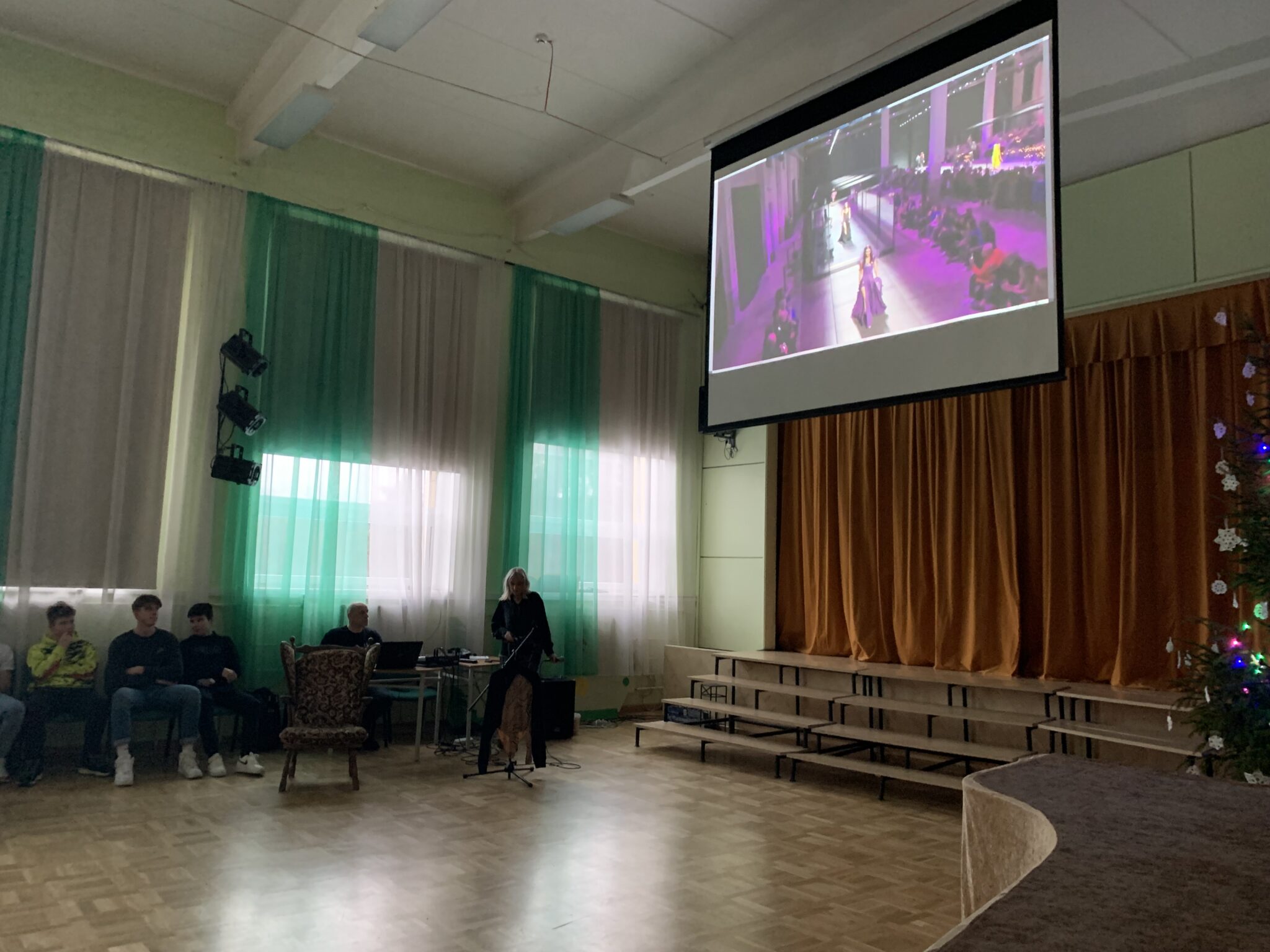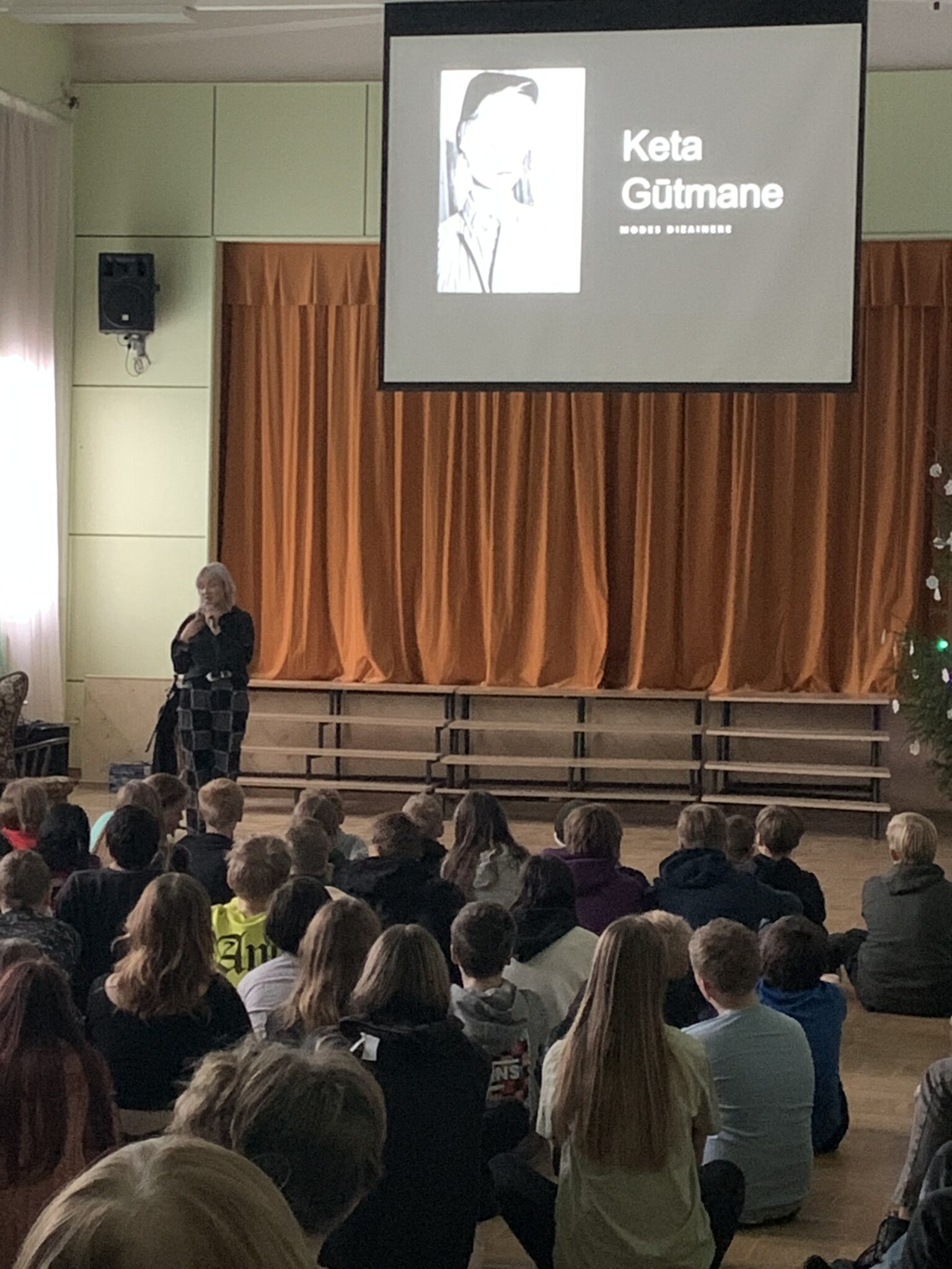 Skolēni ieklausījās Kato stāstījumā par latviešu dizaineriem un viņu radītajiem skatuves tērpiem, iepazina Kato dziesmu video klipus, kuros redzami modes evolūcijas sasniegumi.