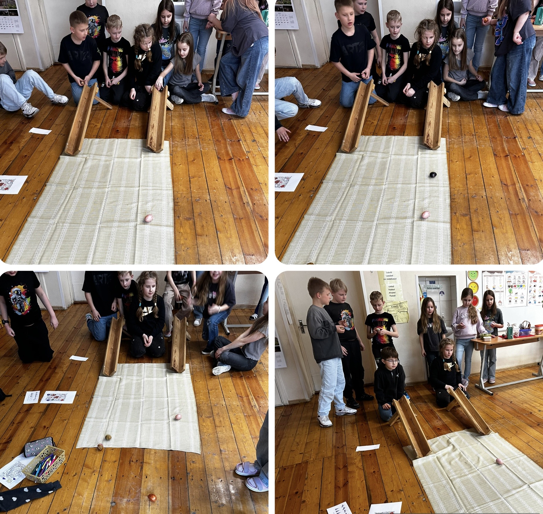 Arī otrklasnieki ripināja olas, taču šajā reizē šī nodarbe vienkārši veicināja bērnu kopā būšanu un prieku.