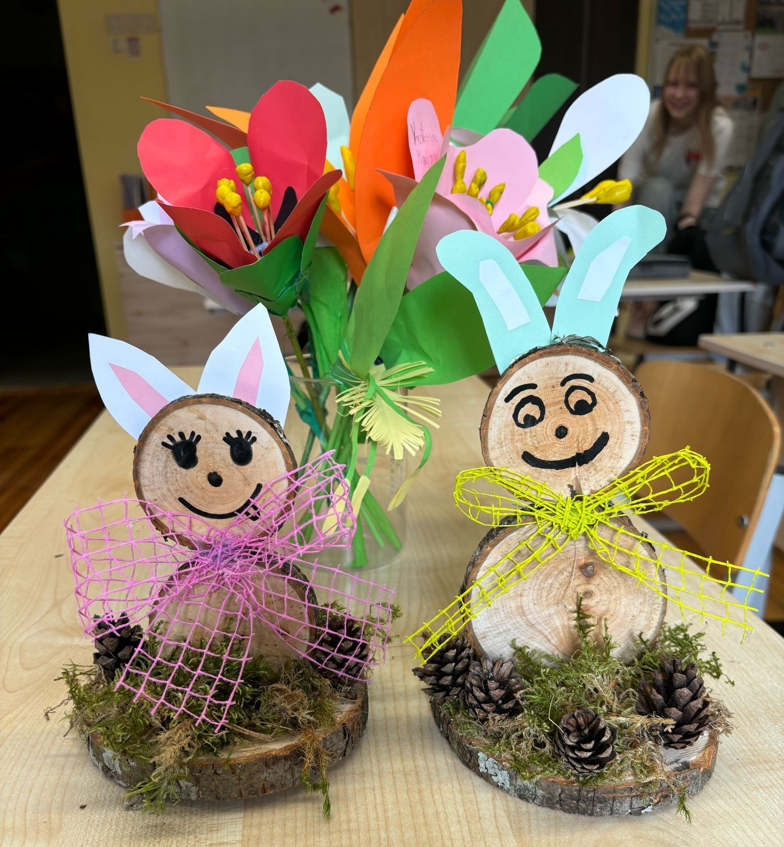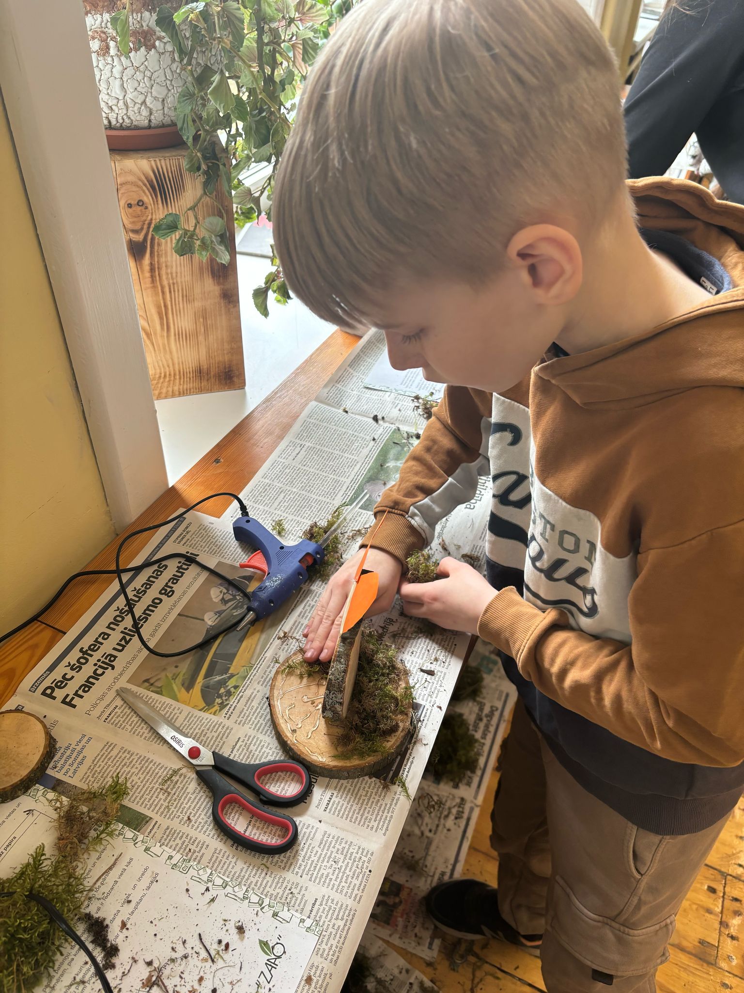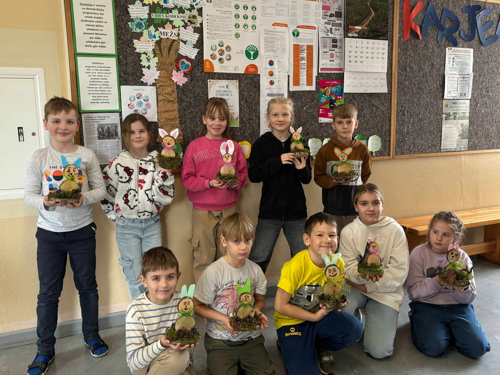 7. aprīlī Ekopadome vadīja nodarbību sākumskolas skolēniem, kur gatavojām Lieldienu zaķi no dabas materiāliem (koka ripām, sūnām, čiekuriem) un papīra atgriezumiem, sasaistot šo ar ekoskolas gada tēmu “MEŽS”.
