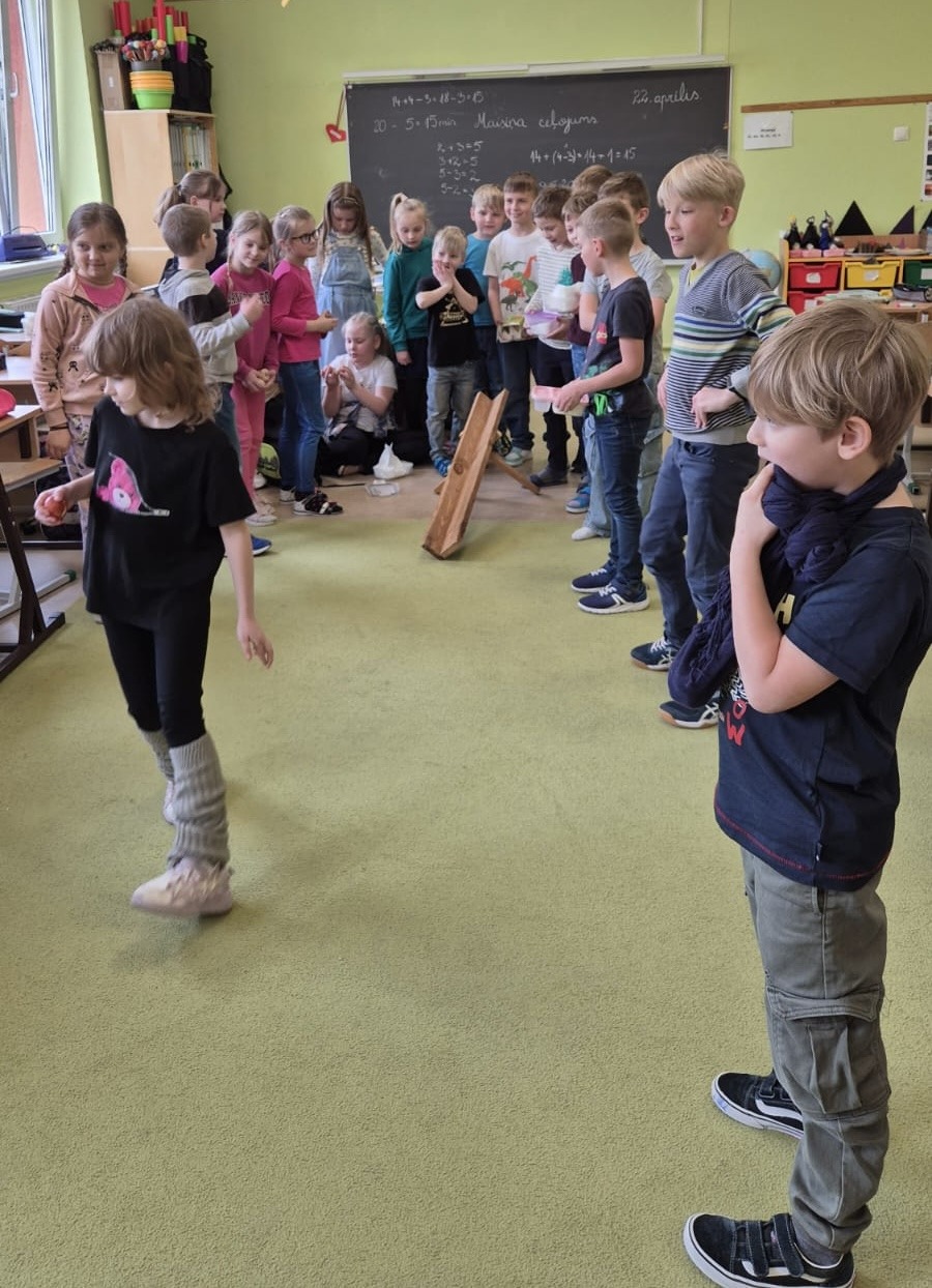2.b klases skolēni svētkiem gatavojušies darinot zaķus, veidojot plakātus par svētku tradīcijām un kopīgi ar 2. a klases skolēniem kāvušies ar olām, pirms tam tās ripinājuši.