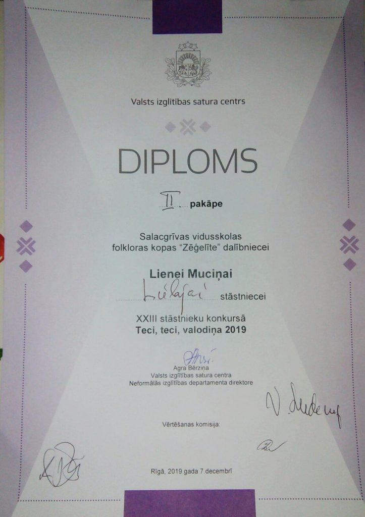 7.decembrī Rīgas Latviešu biedrības namā norisinājās nemateriālā kultūras mantojuma apgūšanas un pārmantošanas programmas “Pulkā eimu, pulkā teku” stāstnieku konkursa “Teci, teci, valodiņa 2019” fināls, kurā Salacgrīvas vidusskolu un folkloras kopu “Zēģelīte” lieliski pārstāvēja 7.a klases skolniece Liene Muciņa, iegūstot Valsts izglītības satura centra 2.pakāpes diplomu. Liels paldies Lienei Muciņai, folkloras kopas “Zēģelīte” vadītājai Zentai Mennikai un Ingai Čekaļinai!
