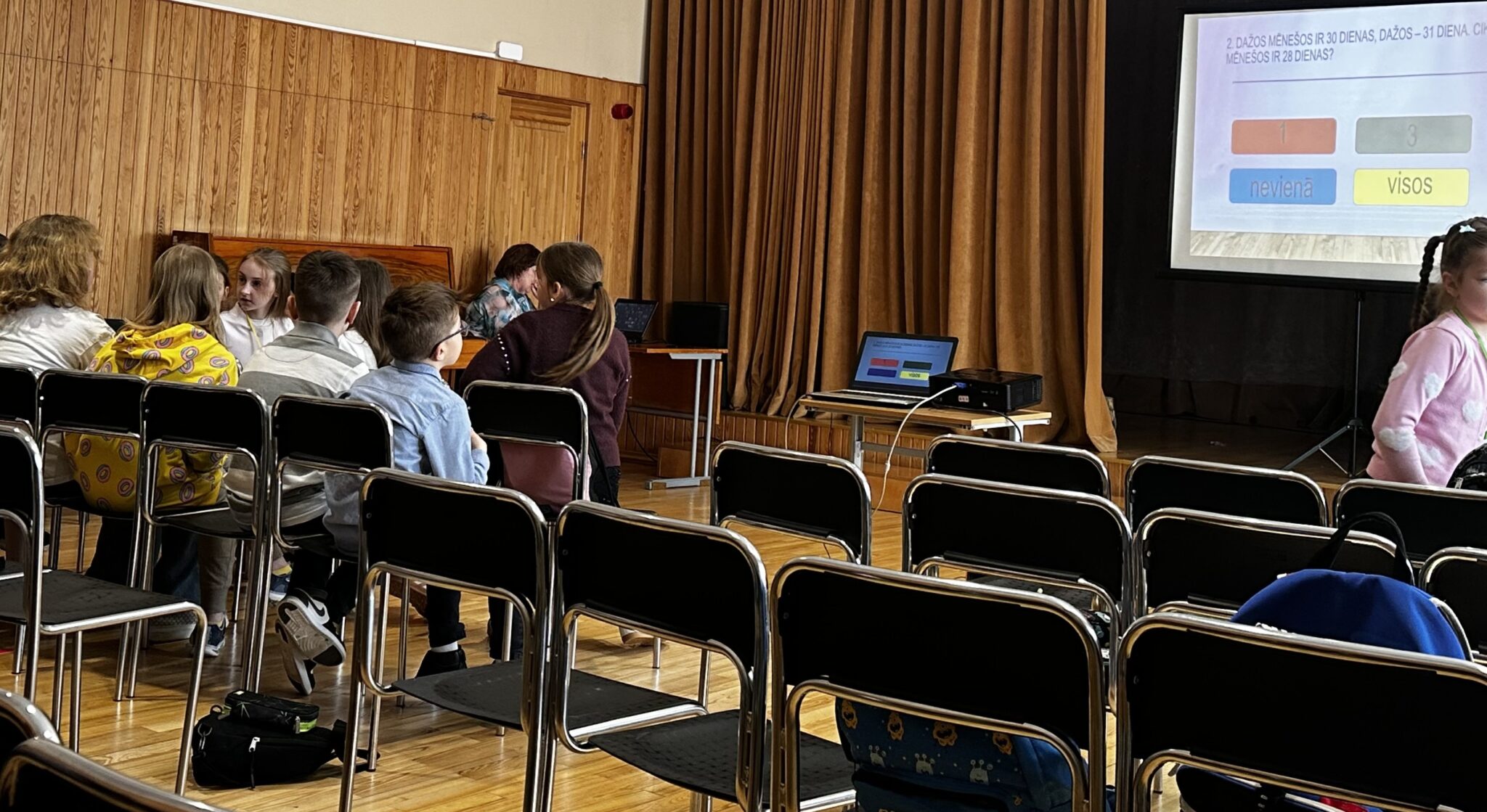 Iesildoties – erudīcijas jautājumi skolotājas Agnijas Bronkas vadībā ( cik zirņu ieiet glāzē? kuram mēnesim ir 28 dienas? utt.:)