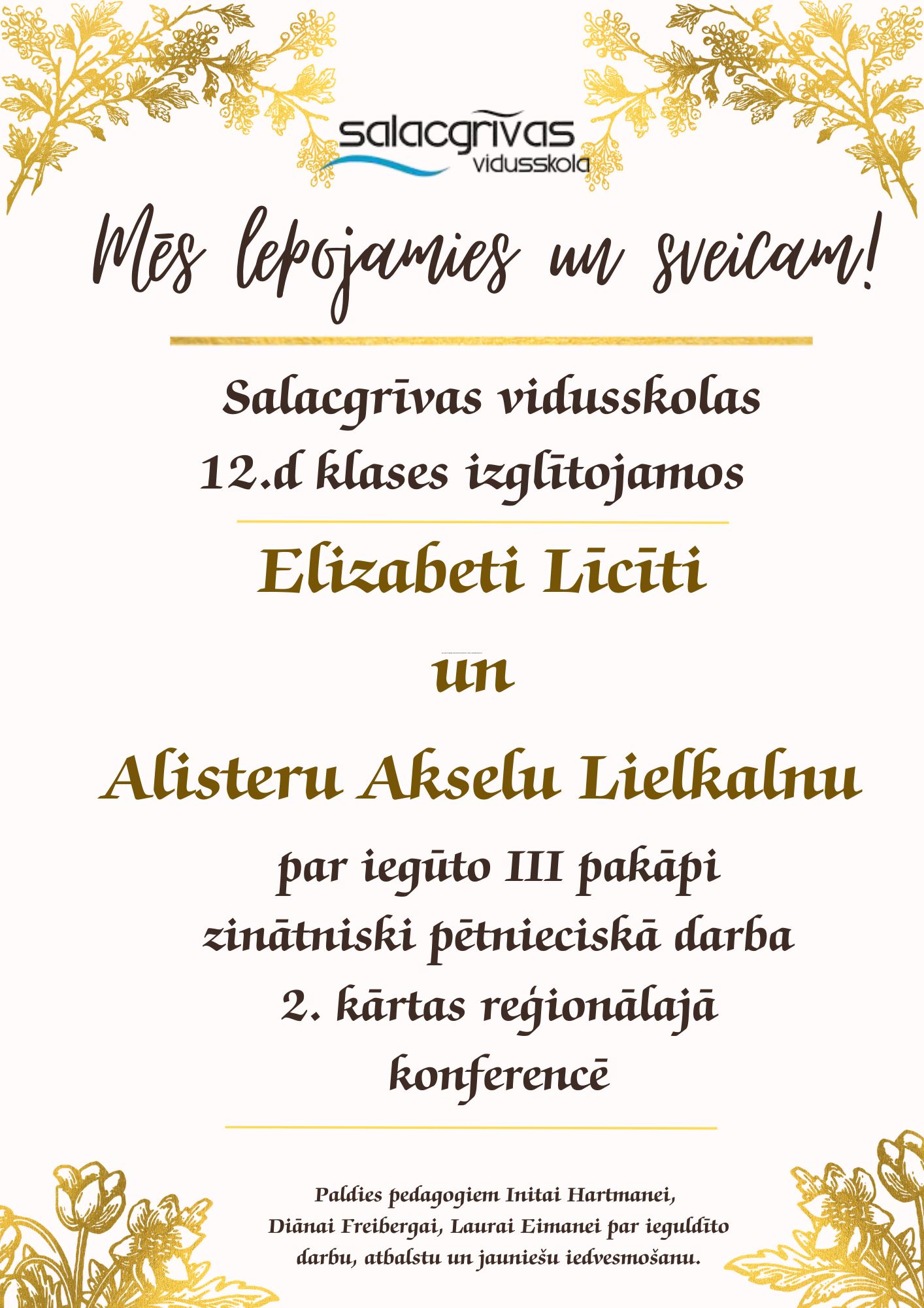 Lepojamies ar Salacgrīvas vidusskolas 12.d klases izglītojamajiem – Elizabeti Līcīti un Alisteru Akselu Lielkalnu, kuri zinātniski pētniecisko darbu 2. kārtas reģionālajā konferencē ieguvuši III pakāpi!