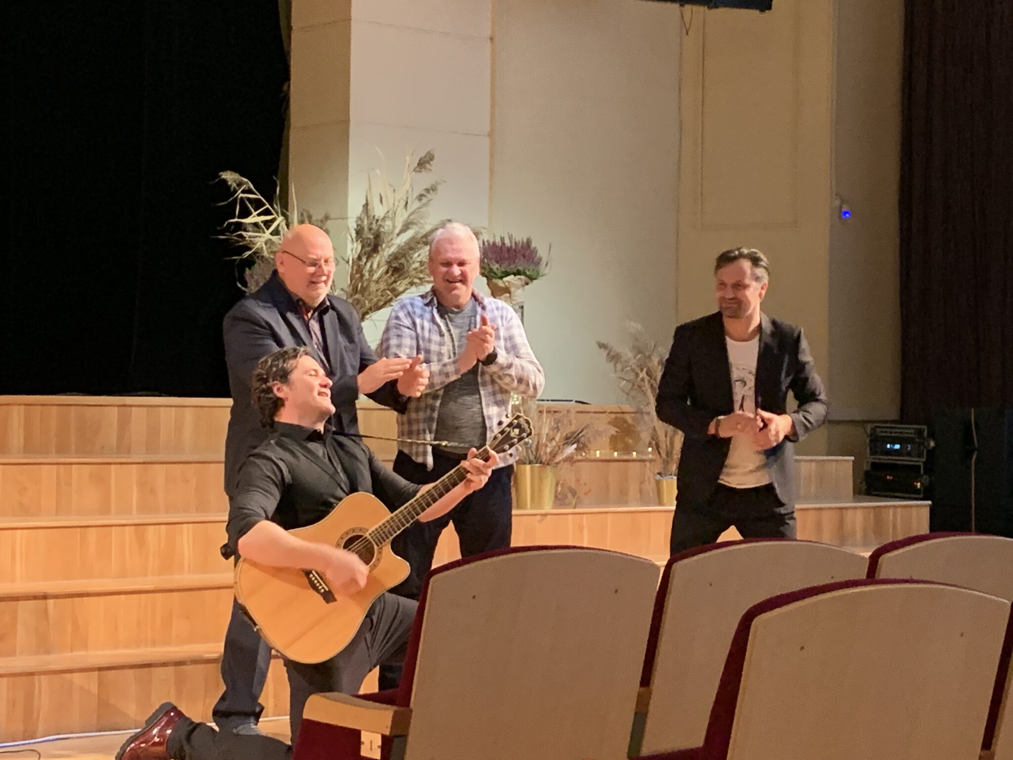 Noslēdzot pirmo metodisko dienu pedagogiem, saņēmām kārtīgu C vitamīna devu, kuru mums sagādāja Dailes teātra aktieri Gints Grāvelis un Andris Bulis, dziedot un lasot nopietnas/nenopietnas dziesmas un dzeju.