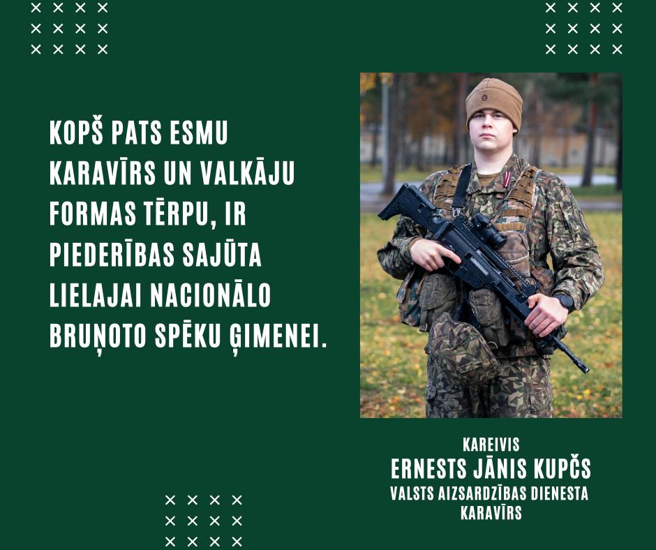 Ernests: “Patriotiskos svētkus mūsu ģimenē svinam. Vecāki vienmēr rūpējušies, lai sarkanbaltsarkanā lentīte būtu piesprausta. Mājās vienmēr plīvo Latvijas valsts karogs un 11.novembrī iedegtas svecītes par godu kritušajiem karavīriem. Jau no bērnības šis laiks asociējies ar militāro parādi un filmu “Rīgas sargi”, ko vienmēr esam skatījušies. Mūsu ģimenē novembra mēnesī vienmēr bijusi pacilātības sajūta! Kopš pats esmu karavīrs un valkāju formas tērpu, ir piederības sajūta lielajai Nacionālo bruņoto spēku ģimenei. Ar pieteikšanos dienestā pierādu, ka esmu savas valsts patriots un pildu savu pienākumu pret Latvijas valsti!”