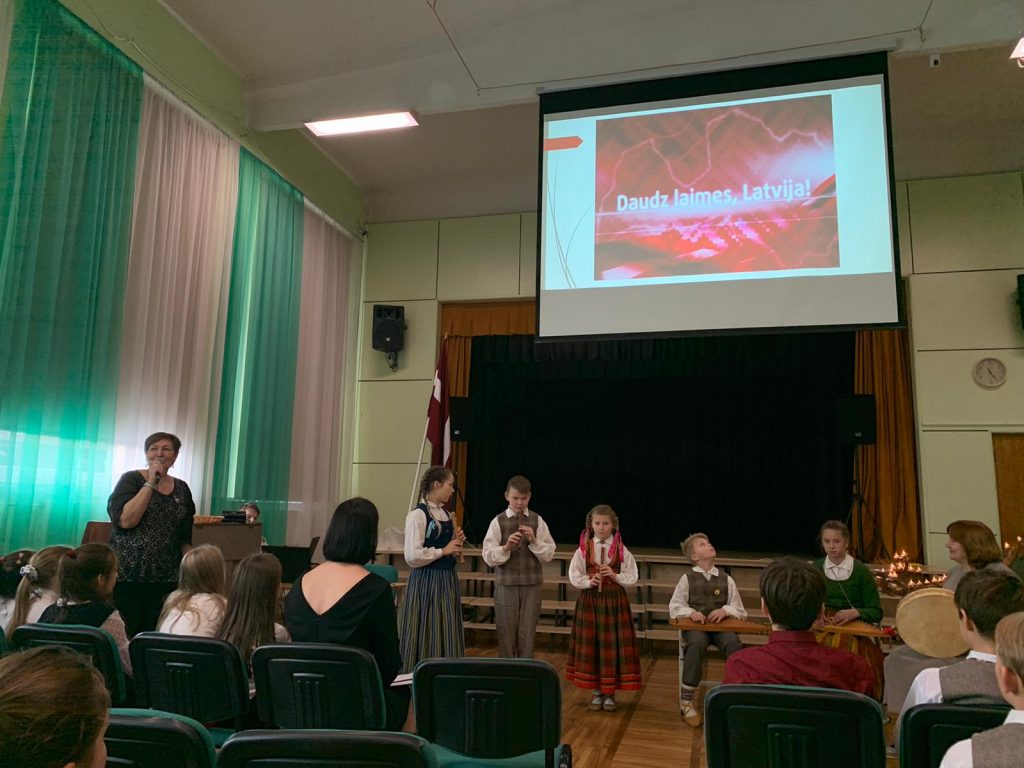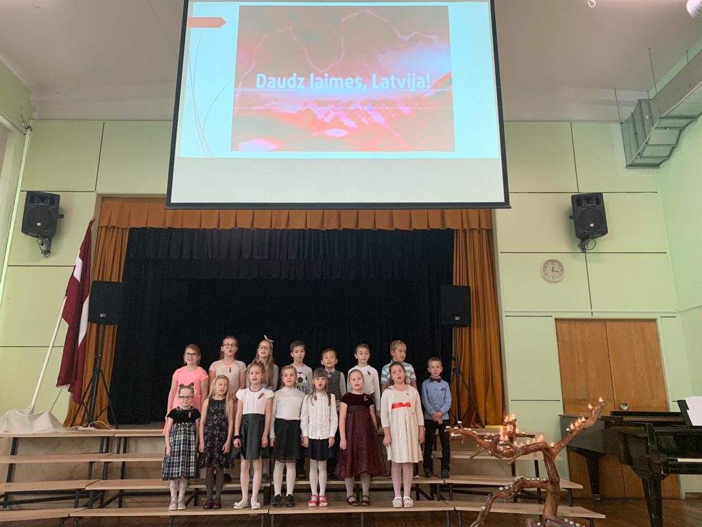 1.-5.klašu skolēni runāja dažādu latviešu dzejnieku Latvijai veltītas dzejas rindas. Vairākiem tā bija pirmā uzstāšanās tik lielai auditorijai. Koncertu atklāja folkloras kopas “Zēģelīte” spēlētais goda solis “ Apaļais mēness”. Tad klātesošos ar dzejas rindām un vēlējumiem uzrunāja skolas direktore Sanita Šlekone.