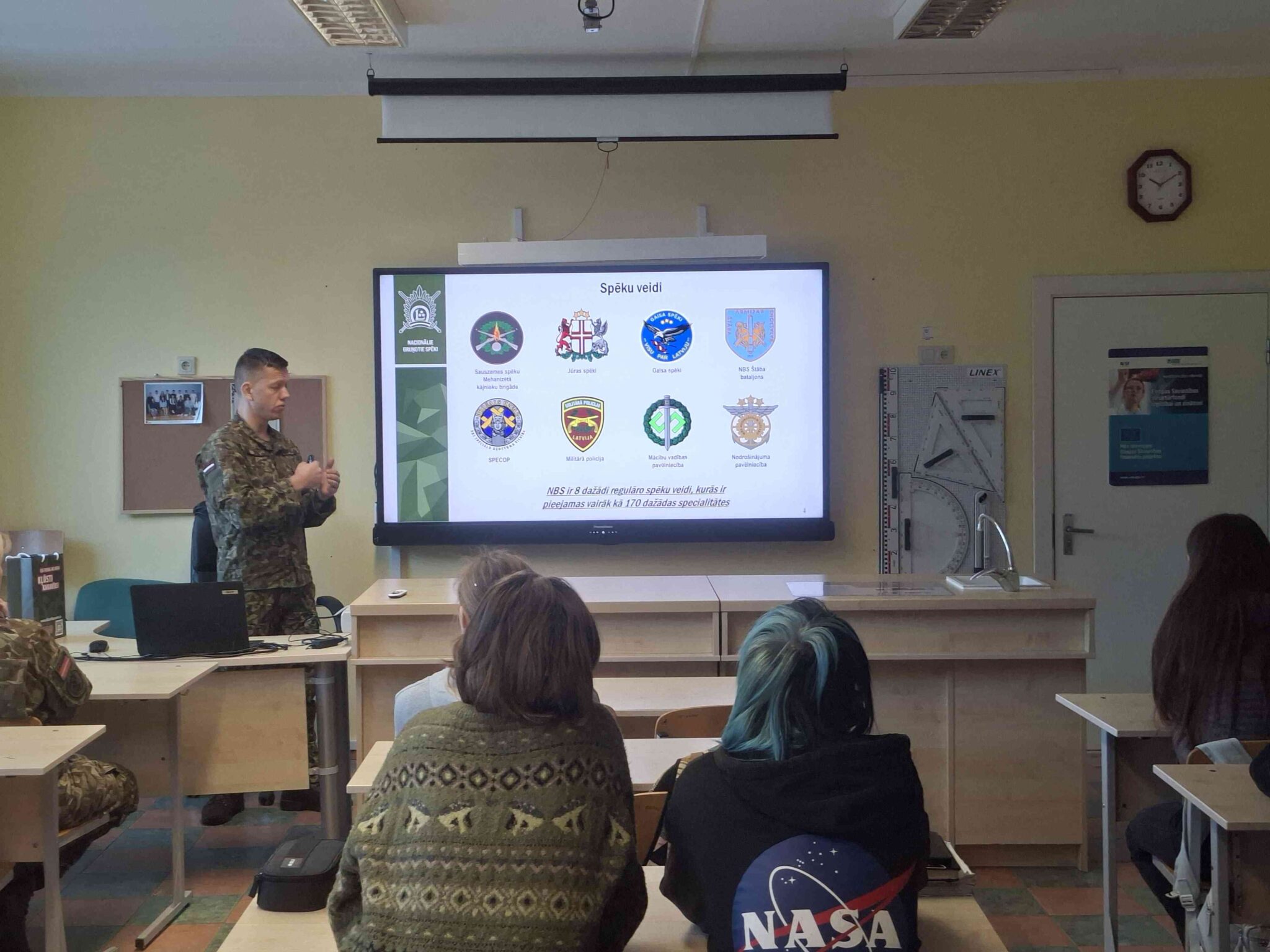 Lekcijā tika uzsvērts, ka ne tikai militārā karjera ir viens no attīstības ceļiem — NBS durvis ir atvērtas arī IT speciālistiem, mūziķiem, medicīnas darbiniekiem, finansistiem, pārtikas tehnologiem un citu nozaru profesionāļiem.