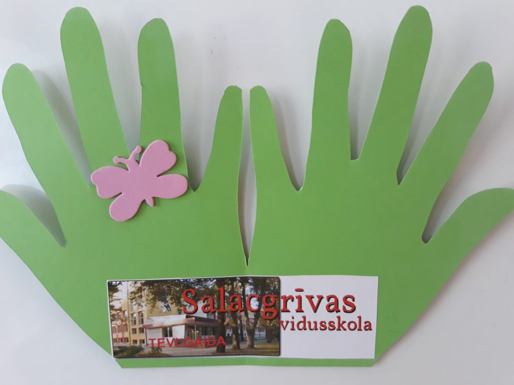 4.a un 4.b klases skolēni bija sagatavojuši nelielu apsveikumu – ielūgumu plaukstiņu formā. Uz plaukstiņām bija skolas attēls un uzraksts “Tevi gaida Salacgrīvas vidusskola”.