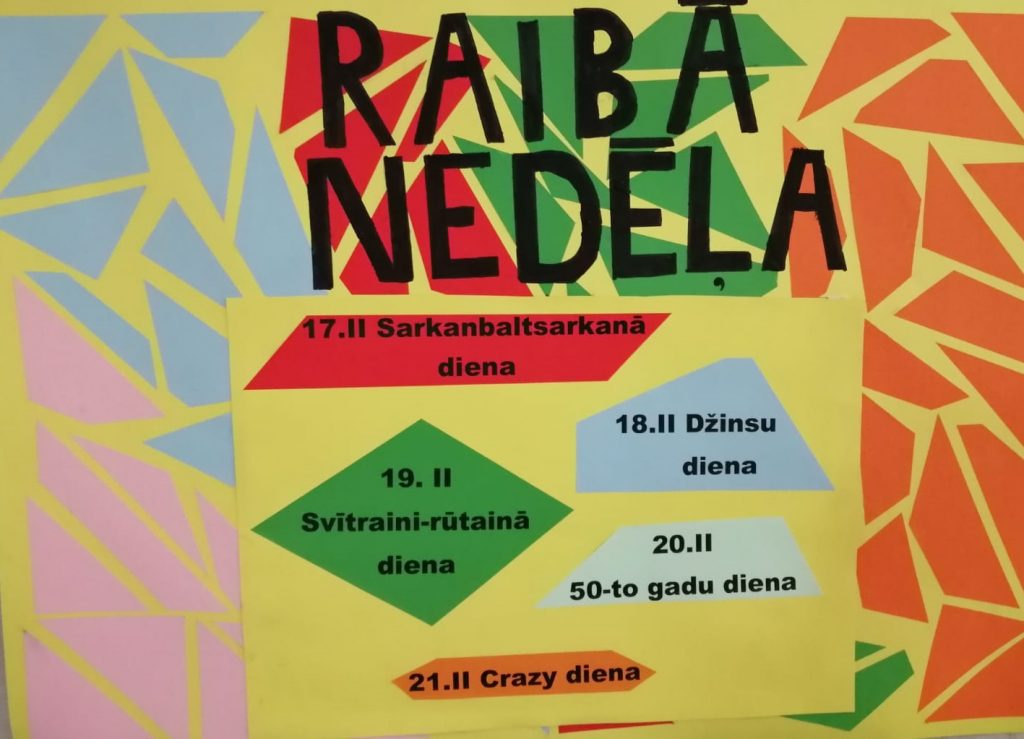 Kad aiz loga pelēcīgi pavasarīgs laiks, tad no 17.-21.februārim Salacgrīvas vidusskolas ikdienā ienesīsim košākas krāsas “Raibās nedēļas” ietvaros. Pirmdienu sagaidīsim sarkanbaltsarkanos apģērbos vai aksesuāros, otrdien – džinsu diena, trešdien mūs sagaida svītraini – rūtainā diena, ceturtdien stilā 50-to gadu mode, taču piektdiena – mazliet nenopietnāka ar Crazy stilu.